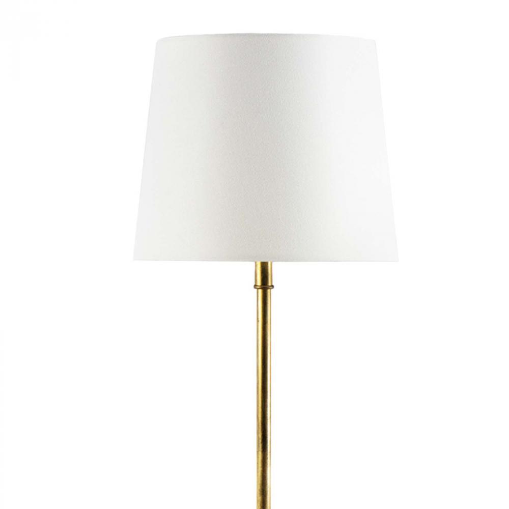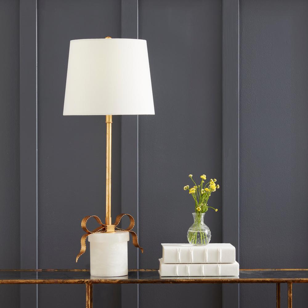 Refined and elegant, the Ribbon Lamp is composed of a tall gold-leafed neck and molded metal ribbon atop a cylindrical, alabaster gift-box base. A uniquely feminine design, the Ribbon lamp would be a darling addition to a nursery, but would also make a chic decor element in a dressing room or bedroom.