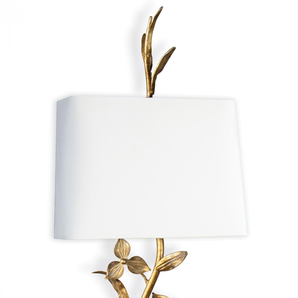 Balancing Old World elegance with rustic charm, each branch of the Trillium Shaded Sconce is cast and gilded in an antique gold leaf finish. A classic, natural linen shade and matching, cast leaf finial completes the masterpiece. Place in a bedroom, living room, or on either side of a cased opening to create a uniquely dramatic statement. When lit, the Trillium comes alive as its gilded leaves bask in the warm glow from above.