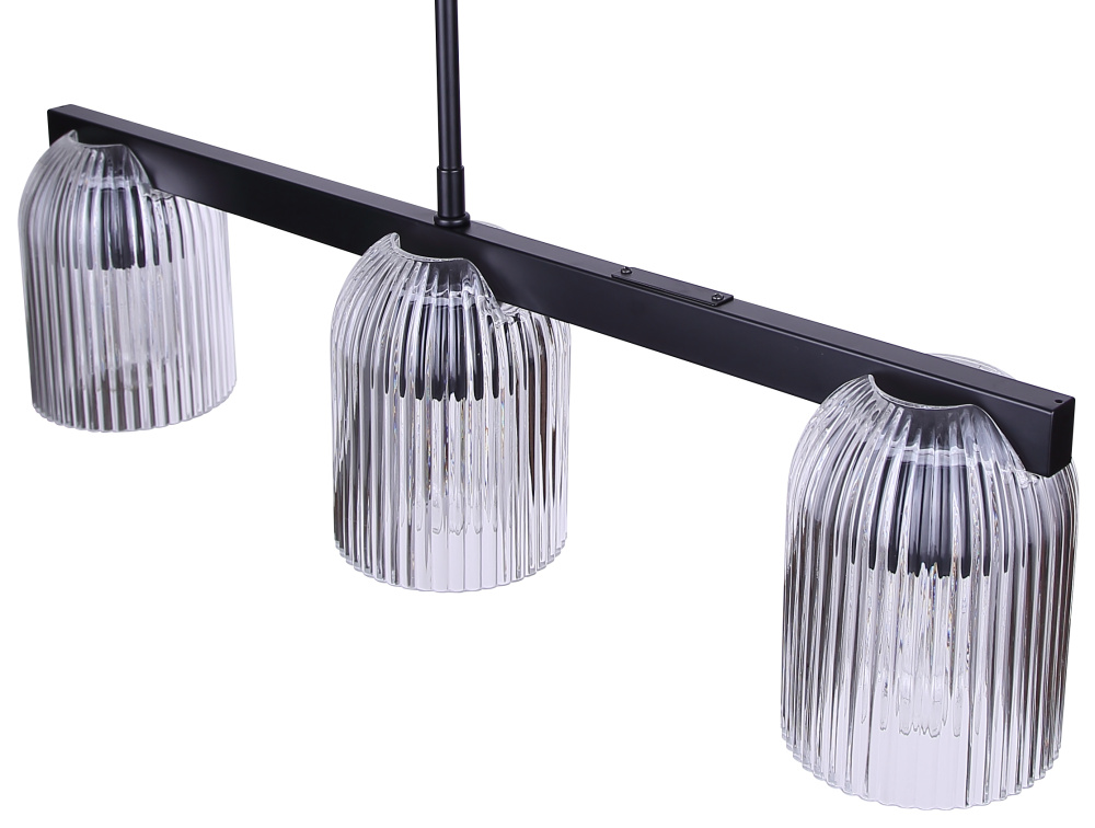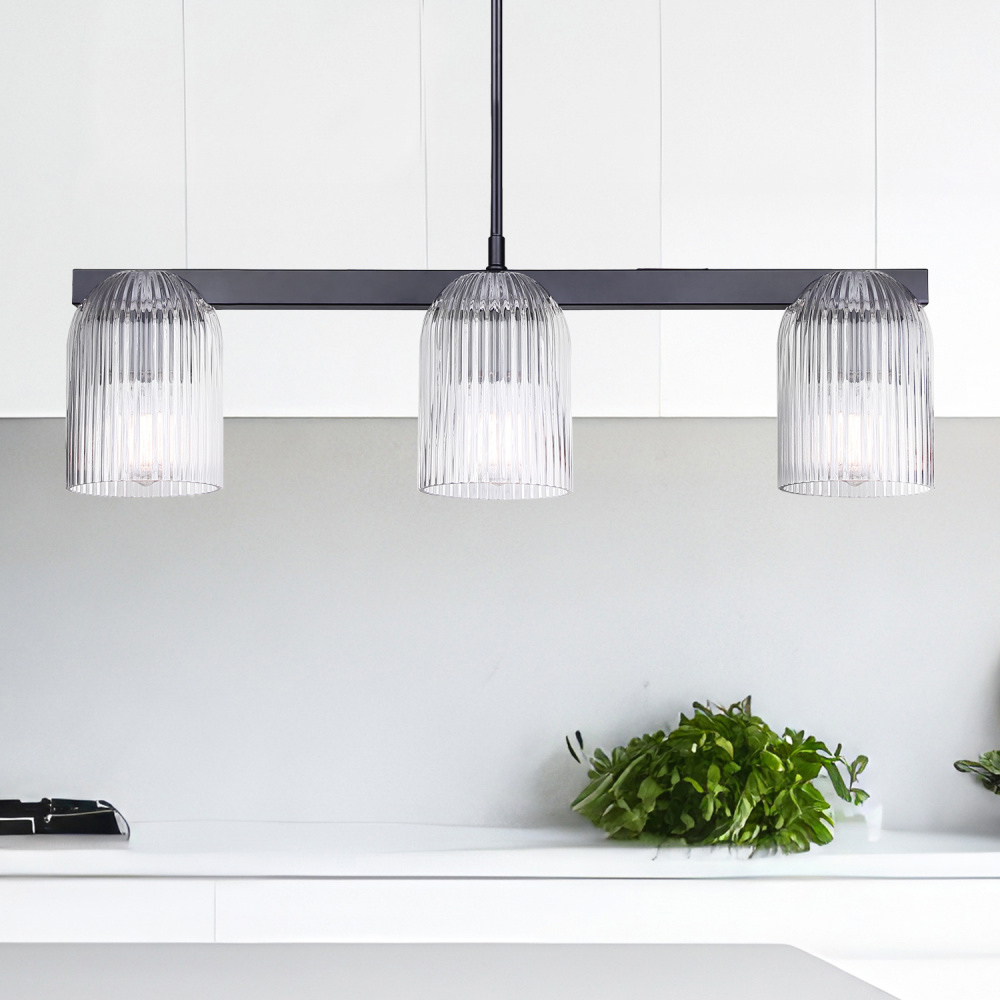The RENZO 3-light chandelier adds architectural edge to contemporary interiors with its bold matte black frame and clear, ribbed glass shades. The modern design offers both focused illumination and striking visual presence. The ribbed glass adds texture, balancing strength with refined detail for a look that feels modern yet timeless. Measuring 28 inches wide and adjustable from 13 to 61 inches, RENZO adapts beautifully to dining rooms, kitchens, or living areas. Subtle luxury and bold design meet in this versatile fixture, perfect for statement-making interiors.