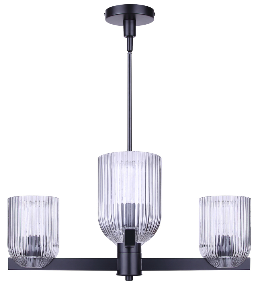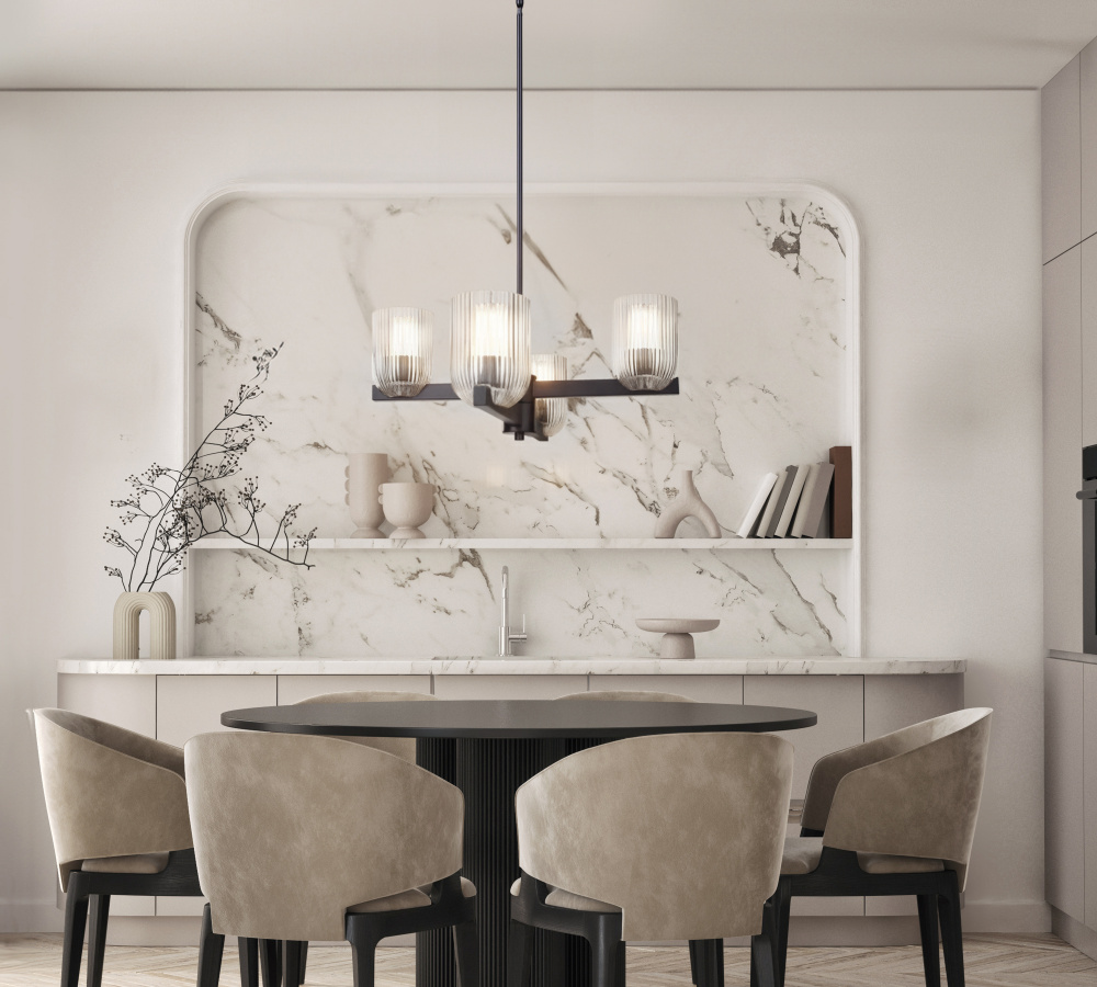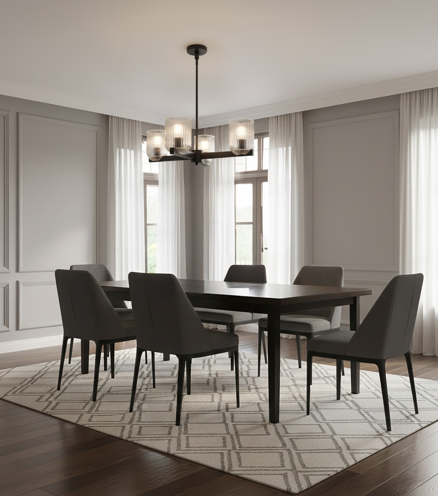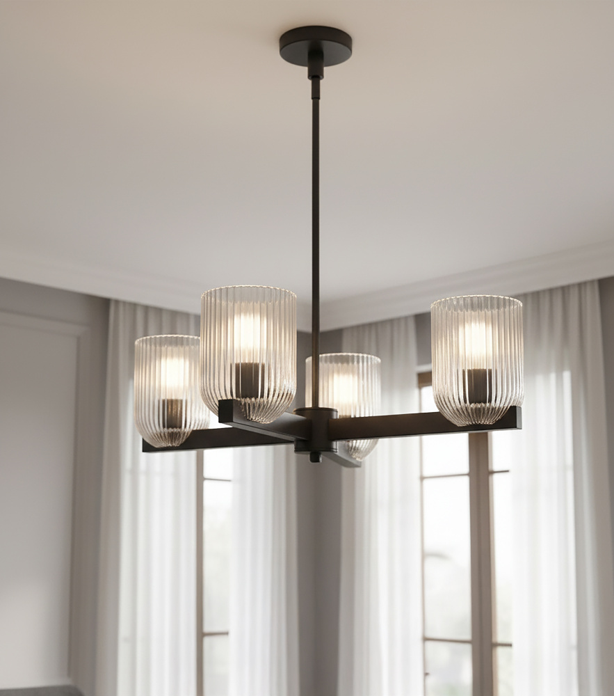The RENZO chandelier blends bold presence with subtle luxury, featuring a matte black frame and clear ribbed glass shades. With four lights, it balances strength and refinement, offering illumination that feels both striking and inviting. The ribbed detailing on the glass adds texture and dimension, complementing the smooth black finish for a contemporary yet timeless effect. Measuring 23 inches wide and adjustable from 17.25 to 59.25 inches, RENZO adapts easily to dining rooms, living spaces, or entryways. Designed for four 60W Type A bulbs, this chandelier is a statement piece for modern and eclectic interiors alike.