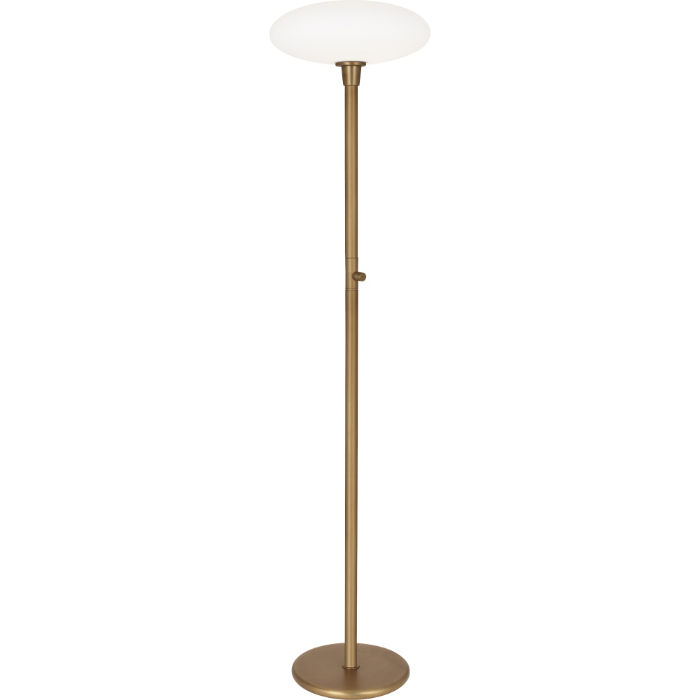Ovo, designed by Rico Espinet for Robert Abbey, features a simple and streamlined design highlighted by a unique, oval, frosted glass shade. This collection radiates brilliant but pleasantly diffused light that will illuminate your modern space perfectly. - Aged Brass Rico Espinet Ovo Torchiere with Frosted White Cased Glass Shade