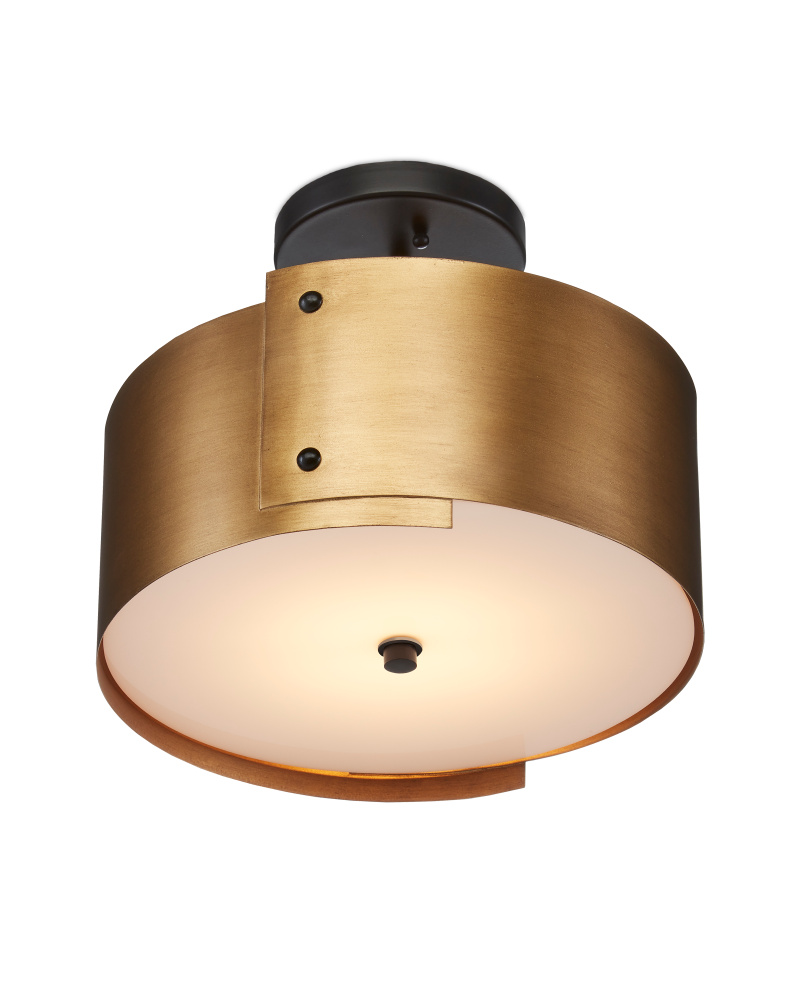 The Ritsu Semi-Flush is inspired by Japanese origami, with its gold form wrapped in wrought iron panels finished in antique brass. The panels are fastened with contrasting black brads, which match the finial securing the acrylic diffuser and the ceiling plate. These dark accents add a touch of sophistication to the design. The Ritsu is equipped with integrated LED technology for modern functionality.