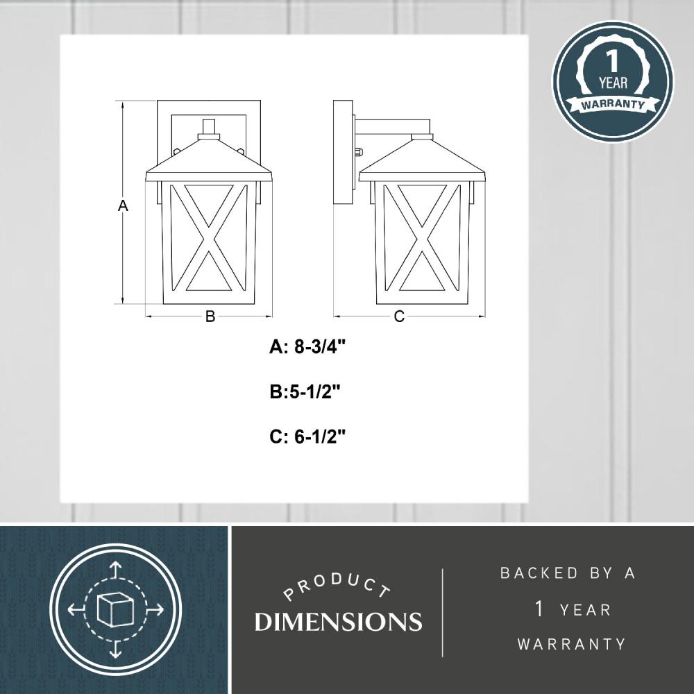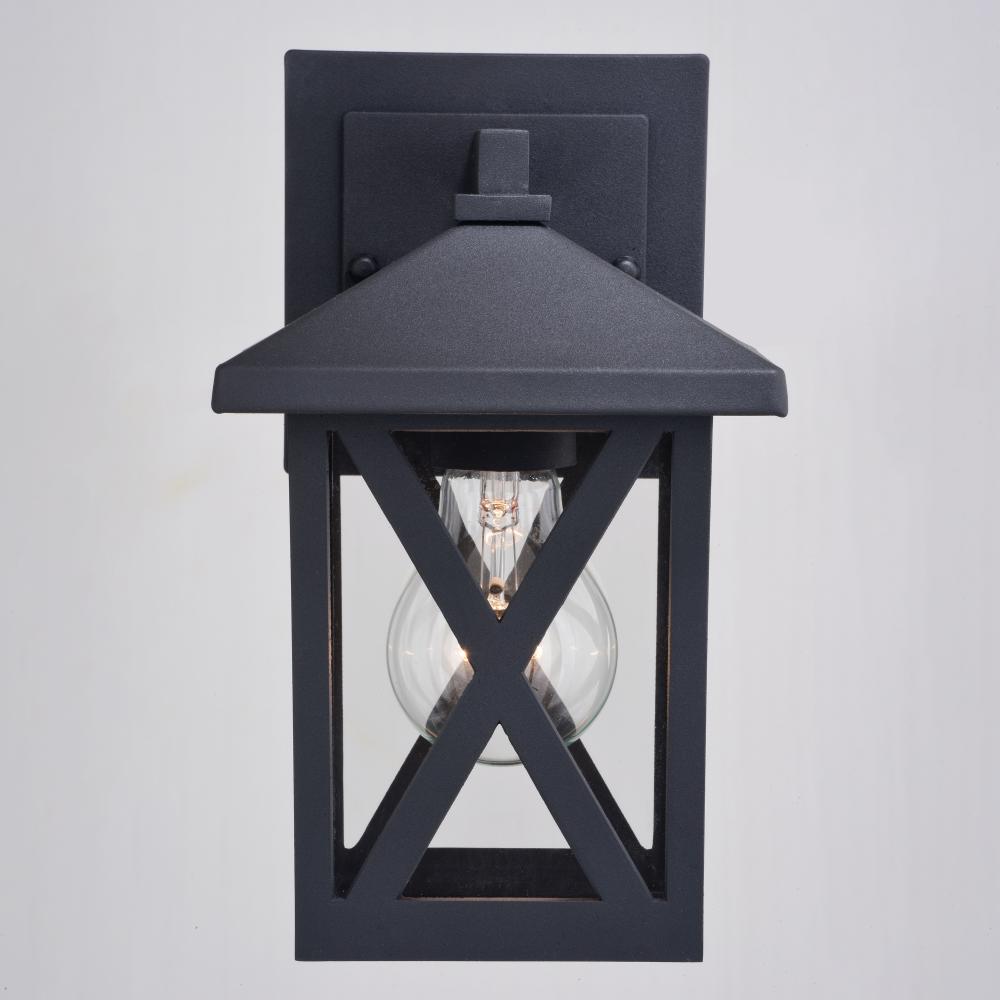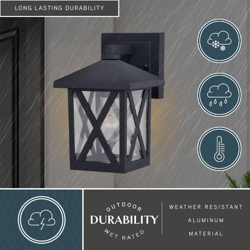 The Rockford collection brings transitional style to the classic wall lantern, yet at a low price. Clear glass panels are capped with a tapered top and finished in a textured black. The crisscross windowpane pattern on the sides draw the eye up and around. Made of corrosion resistant cast aluminum, this outdoor wall light is ideal for porches, entryways, garages, or any other area of your home.