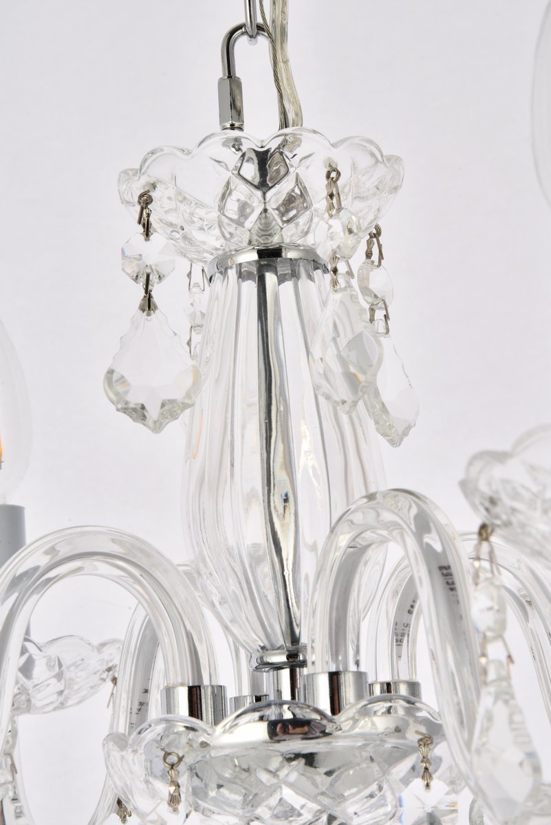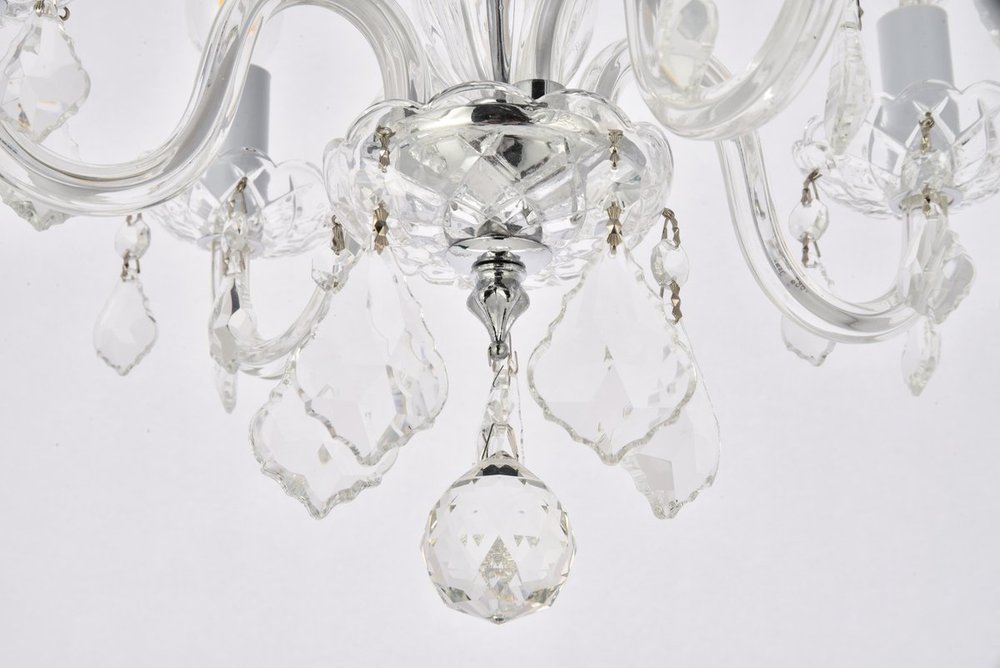 The 7804 Rococo collection was inspired by the lavish elegance of 18th century France, known for its graceful curves and light colors. The steel frame, available in an array of finishes, is highlighted by curved glass arms, a glass vase, and glass holders for the candelabra bulbs. Dangling from the delicately etched glass plates on three levels are royal-cut octagon and pendeloque crystals. It all comes together with a faceted glass sphere at the bottom. Optional shades of acrylic and organza add coziness to the glam. Petite in size yet grand in appearance, Rococo hanging pendants are perfect for enhancing the décor of smaller areas in your home.