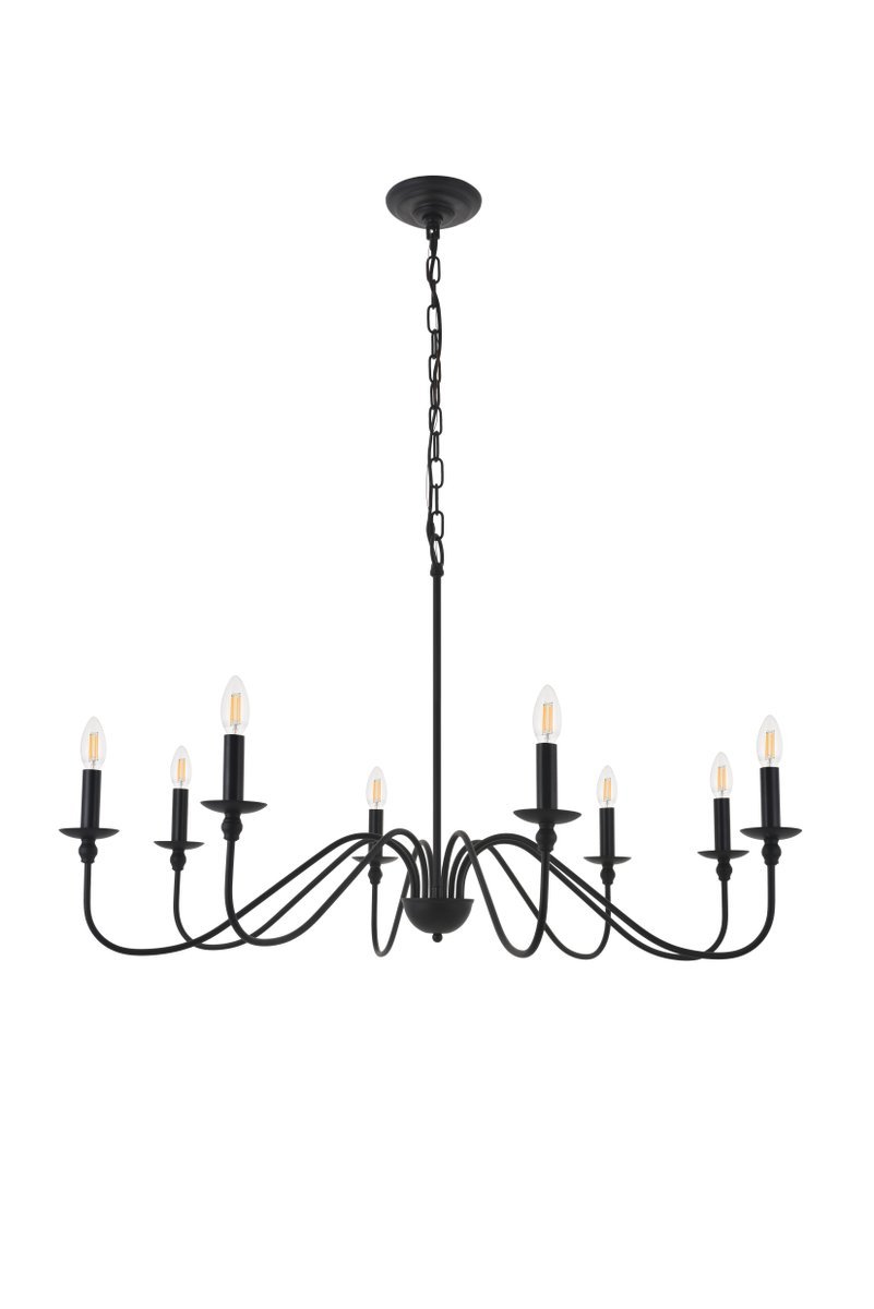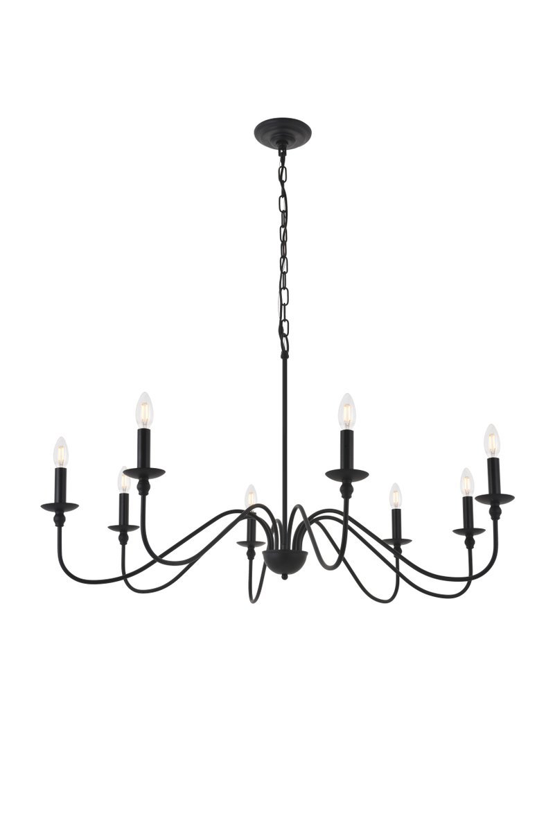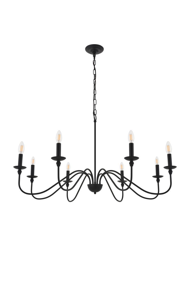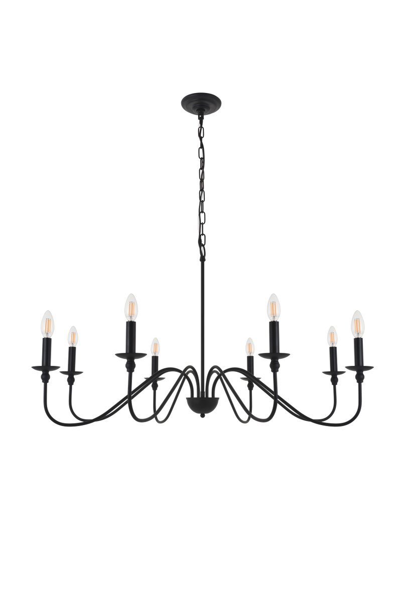 Minimalistic matte black chandelier pendant with 8 gently undulating arms and lights
