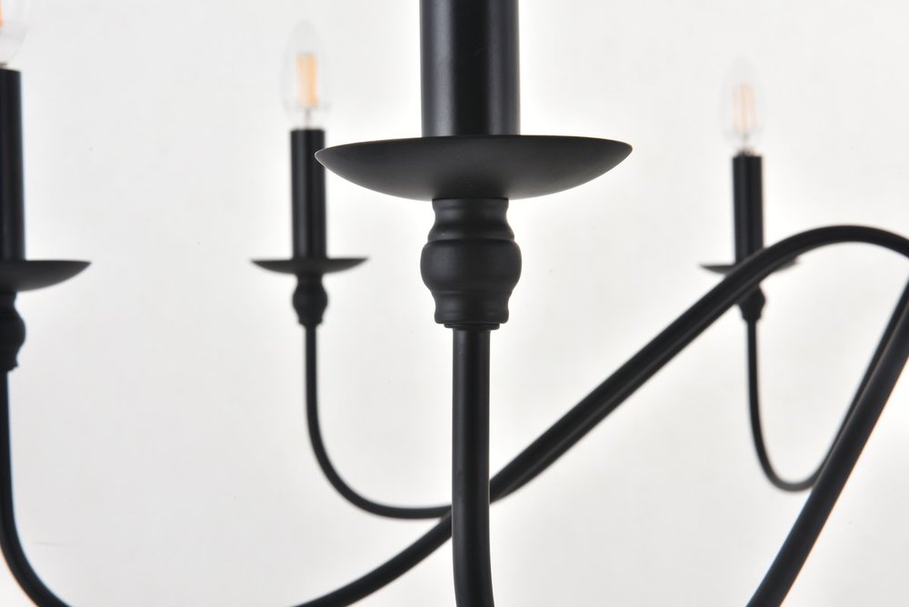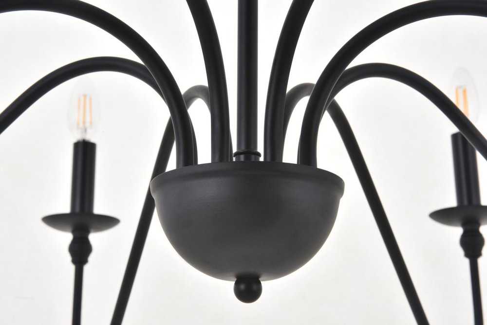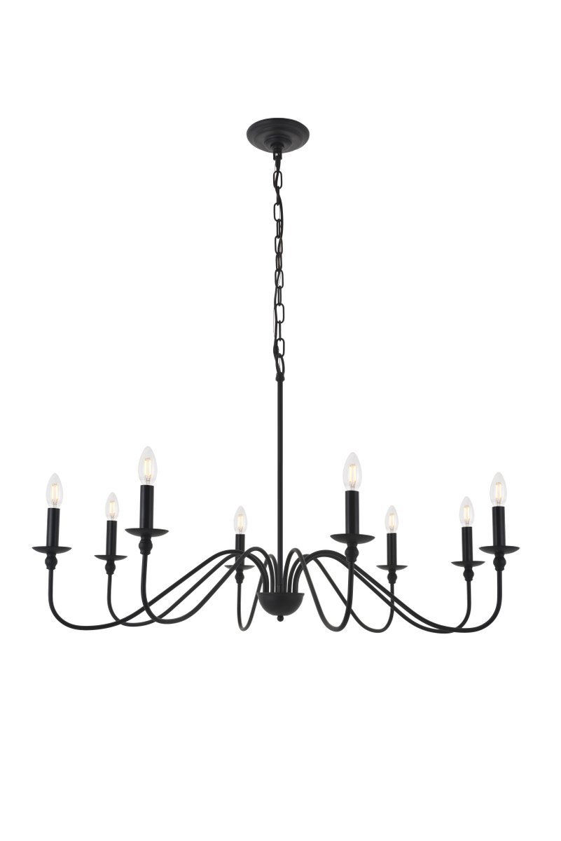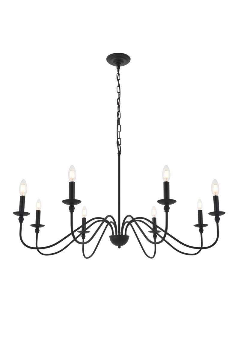 Minimalistic matte black chandelier pendant with 8 gently undulating arms and lights