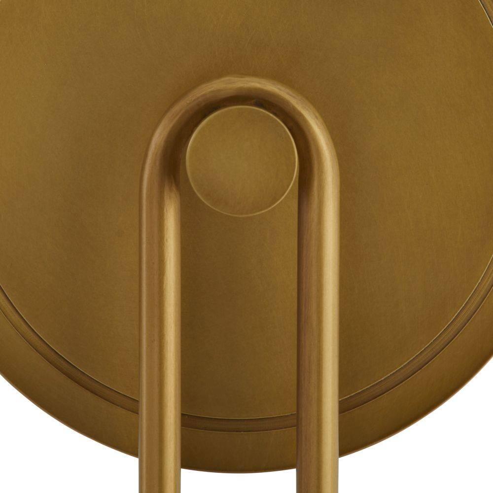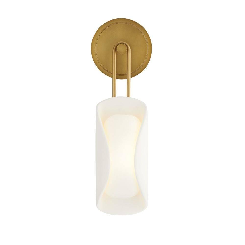 The Roll sconce is a study in soft curves, with a creamy ivory resin shade and frosted opal glass light, lightly suspended from an antique brass-plated iron plate.