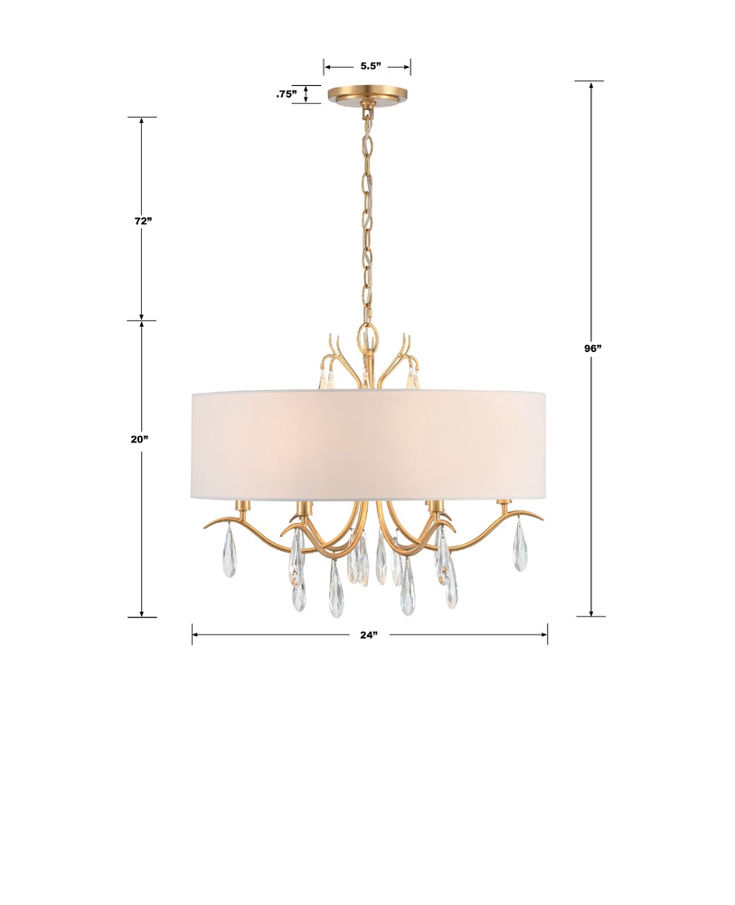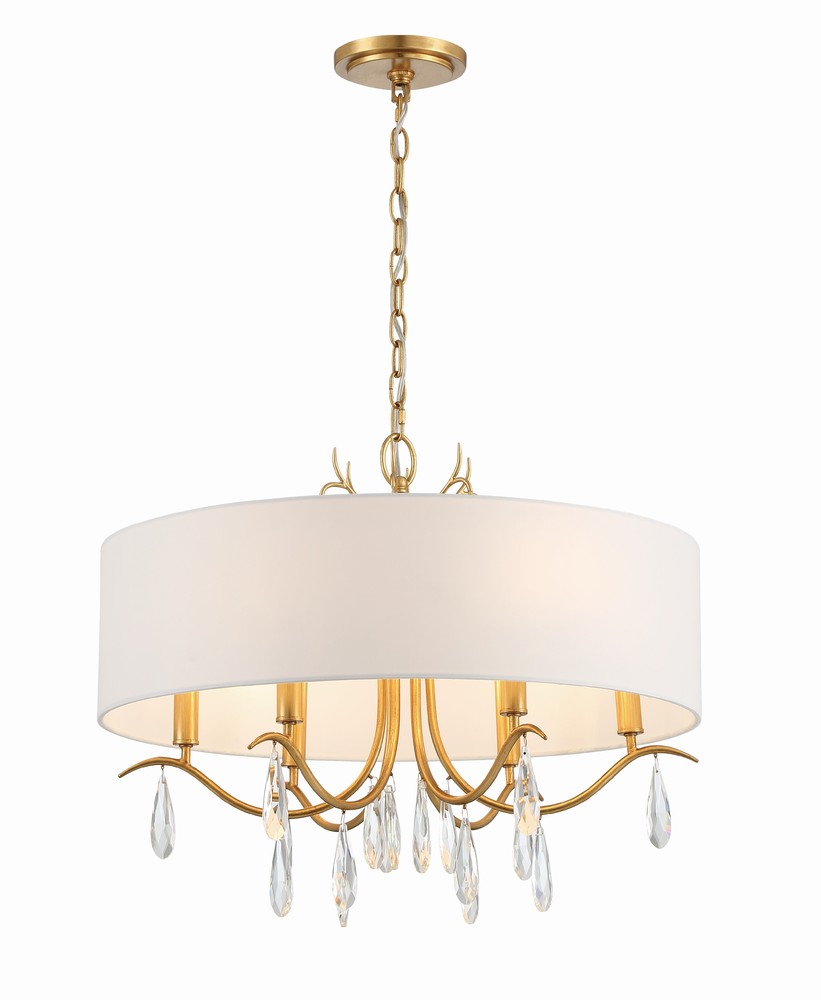 Rollins drum chandelier is a classic design versatile to fit traditional and modern settings. A large white round silk shade beautifully contrasts its Antique Gold finish. The organic inner metal frame features swopping arms and elongated crystal drops. This elegant collection provides an elevated and timeless look to an interior setting.