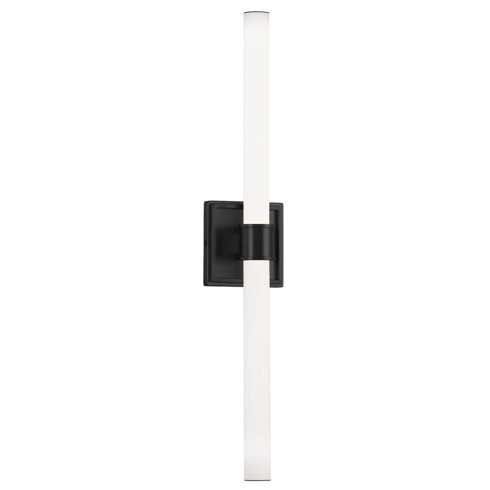 A tubular length of illuminated rod the Rona wall light is supported and clasped with a detailed cylindrical projection. The thick square outline of the attachment plate frames the lamp holder and echoes the refinement of present architectural trim. Available as either a sconce or vanity and in several curated finishes.