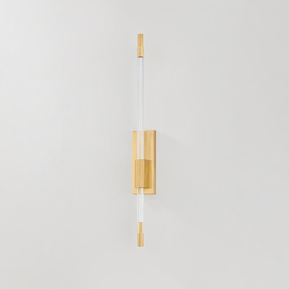 Clean lines, transparent layers, and sleek metalwork define this modern sconce. Exploring an innovative lighting technique, Rosco features a thin edge-lit acrylic rod inside an extruded glass tube. Creating a remarkably slim overall silhouette, this double-layer of diffusion emits a warm light output. Designed as a bath sconce, Rosco is finished with classic Aged Brass hardware.