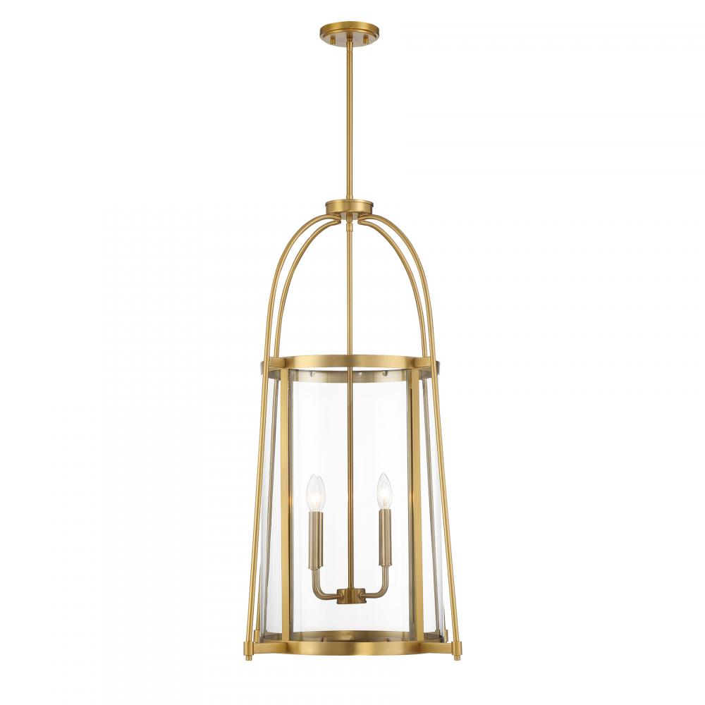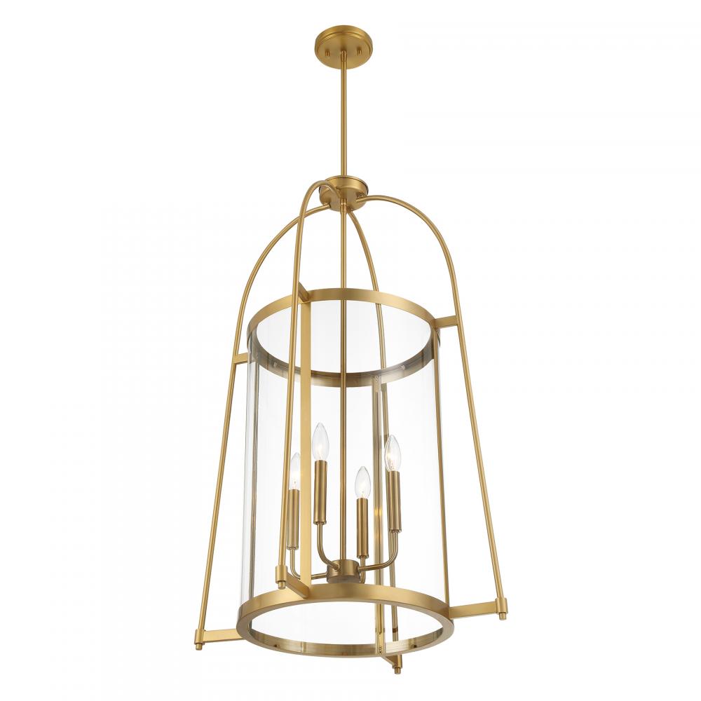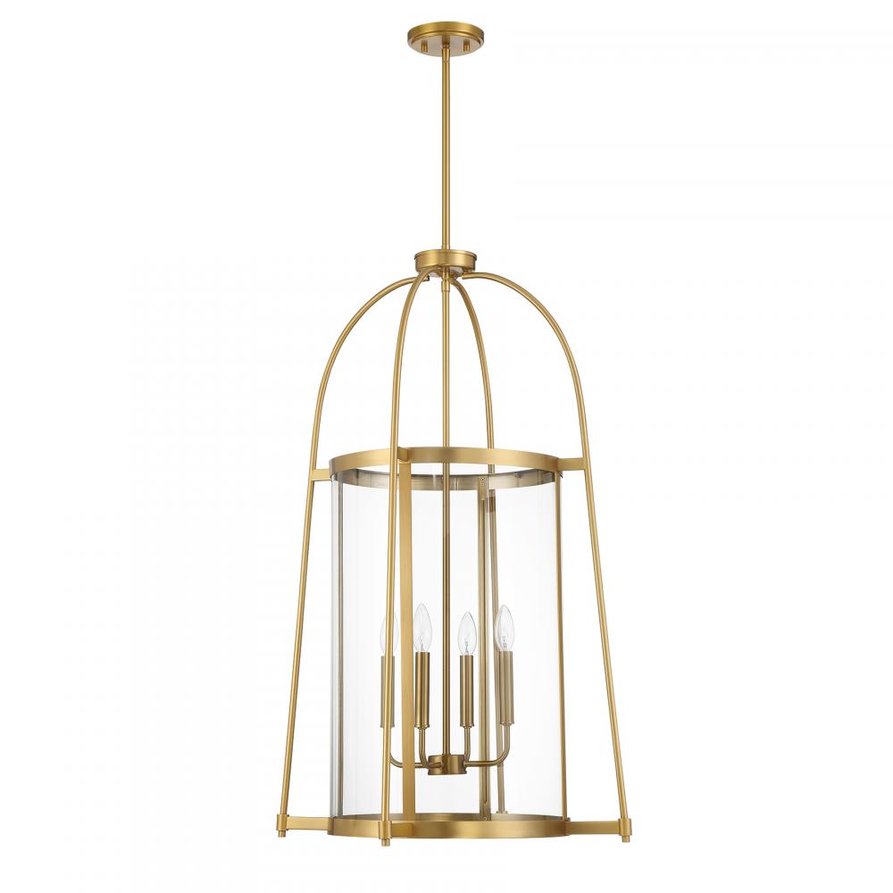 The Savoy House Rosedale 4-light pendant will bring a stylish, geometric presence to any space. It features a clear glass shade and a Warm Brass finish. Rosedale is 23" in width and has an adjustable height ranging from 37" to 91". Comes with four 12" downrods and one 6" downrod. Uses four candelabra size bulbs of up to 60 watts per bulb. Bulbs not included.