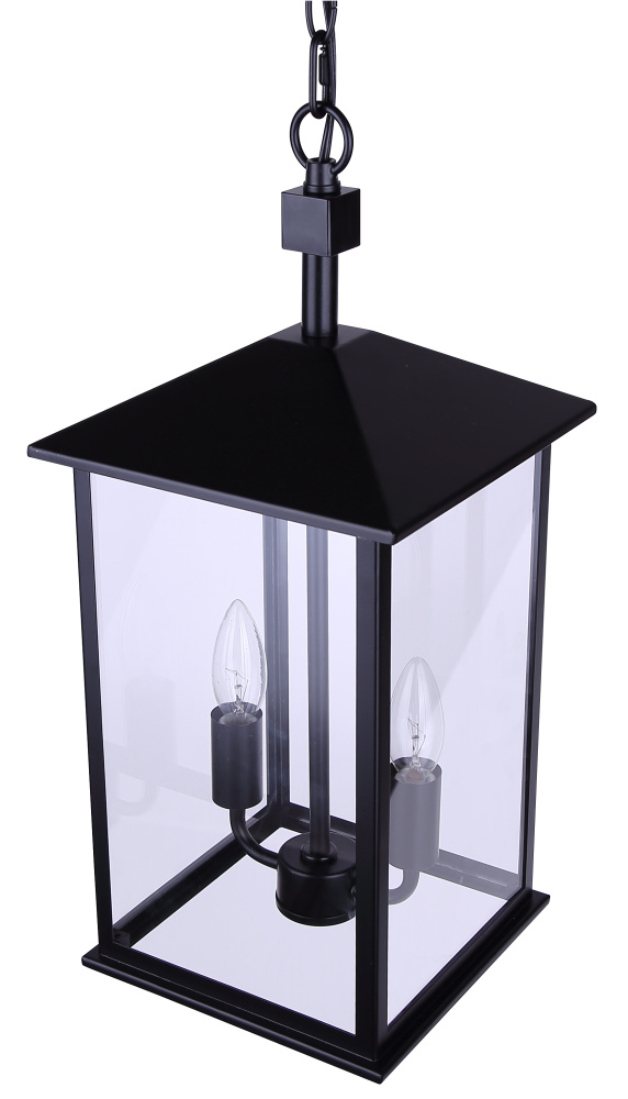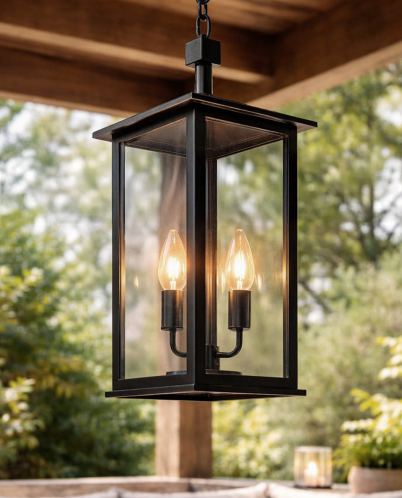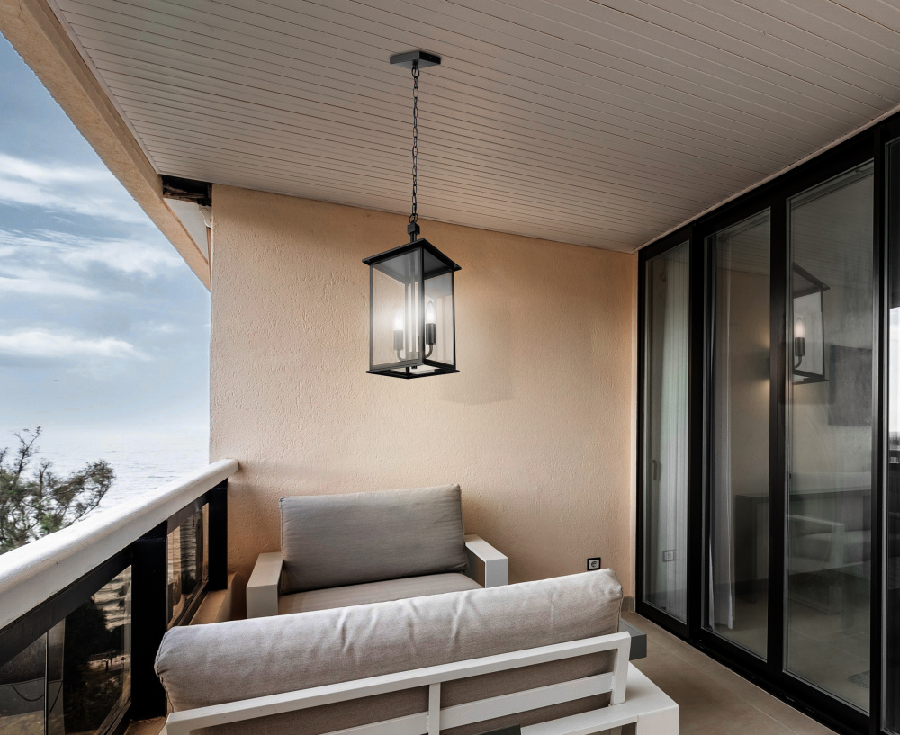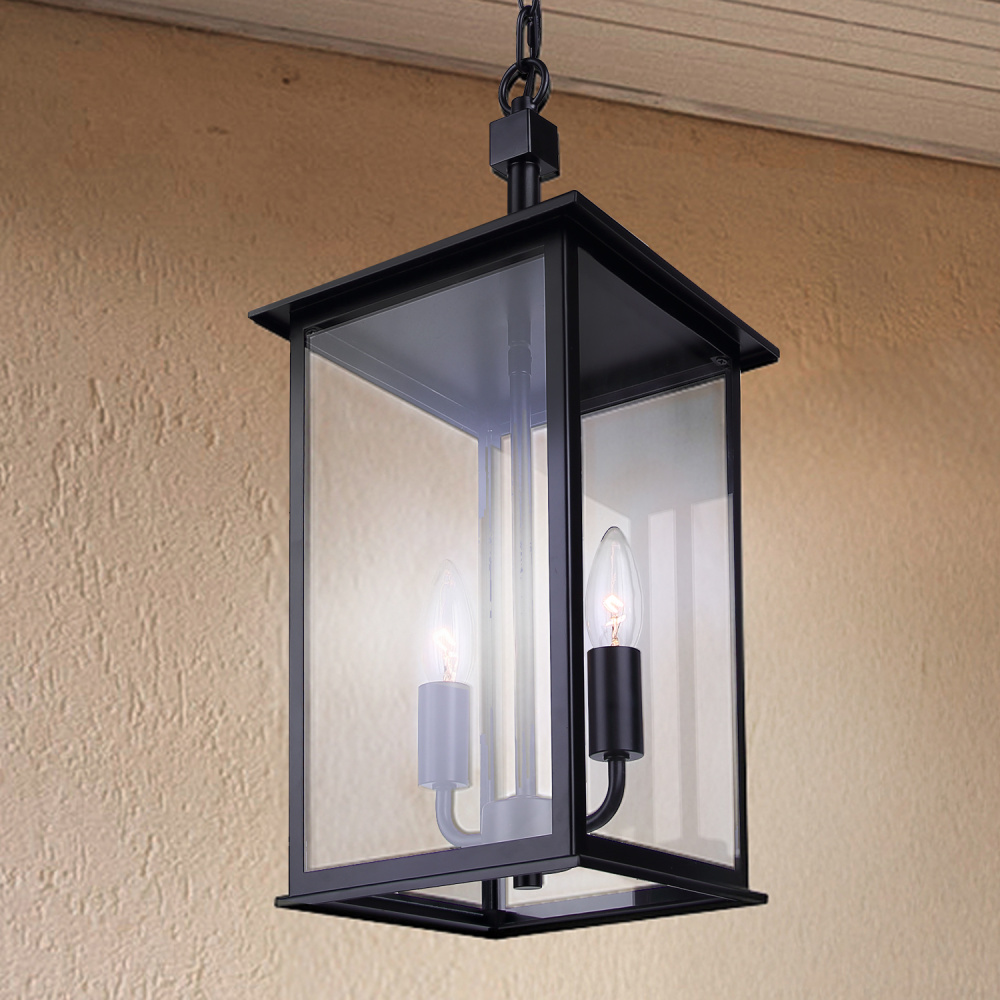 Contemporary Outdoor Pendant: Matte black rectangular frame with clear glass panels offers a sleek, modern look that complements a variety of exterior styles.