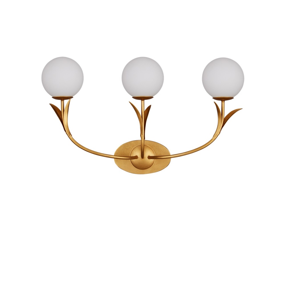 If the Rossville Triple-Light Wall Sconce didn't have such contemporary lines, it could be a throwback to a nostalgic time when globe lights proliferated in ice cream parlors and theaters. But this nature-inspired gold sconce is more modern in its makeup with the thin arcing leaves that flow from it. Made of wrought iron in a contemporary gold leaf finish, the bobeches balance its three white glass globes brilliantly.