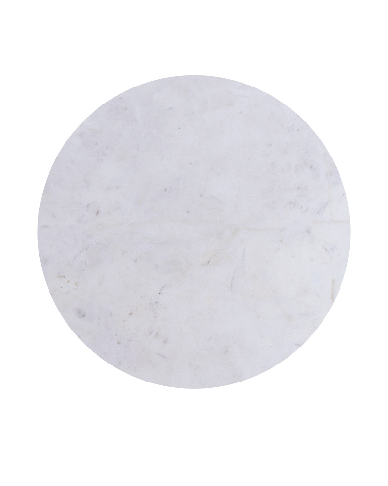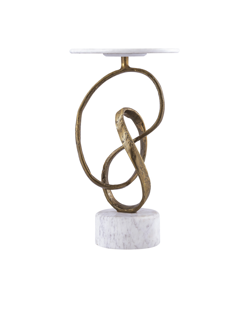 The masculine design of the Ruben Accent Table has a number of special attributes that include the rough luxe feel of the curling metal ribbon, and the contrasting white marble base and top. The ribbon, which is made of cast aluminum in an antique brass finish, rises from the stone base to hold the thin white top in place. The natural veining in the stone will make each piece unique.