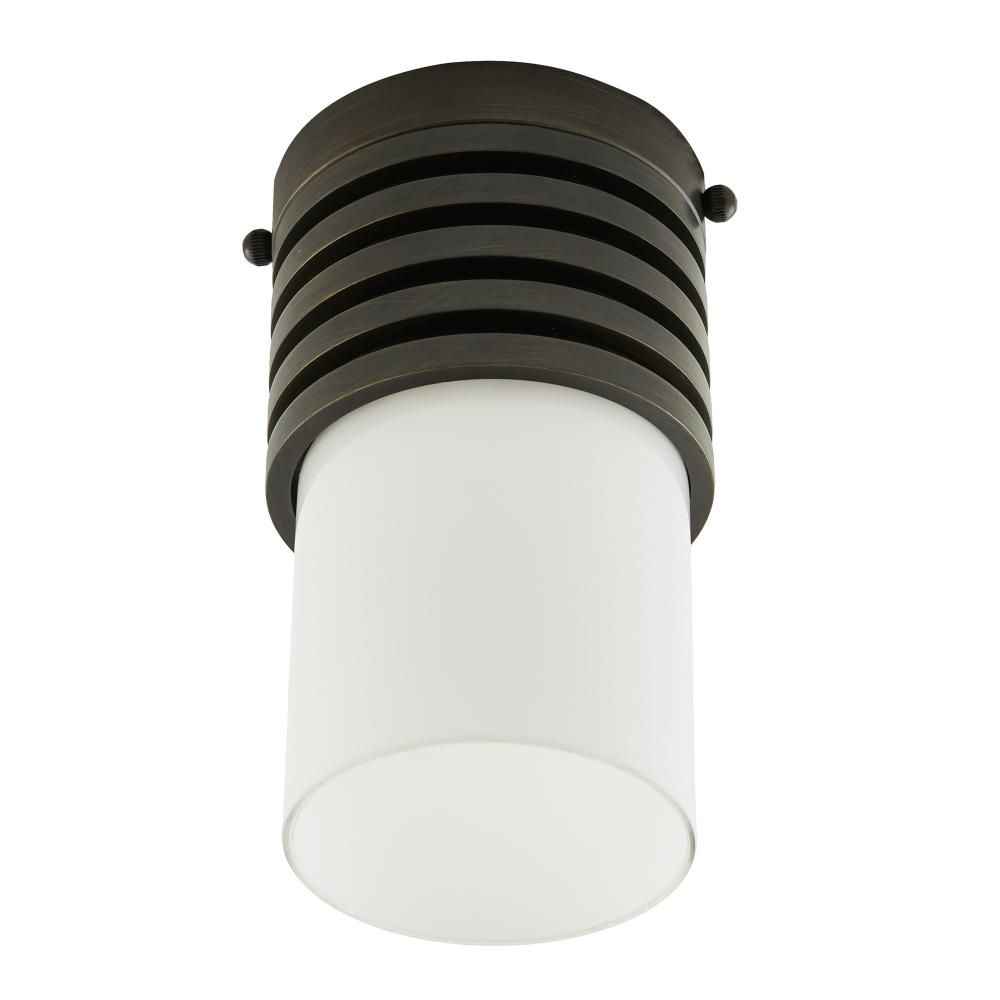 Formed with a machined look, as if turned on a lathe, the Rune Flush Mount is finished in English bronze iron with an opal glass cylinder shade. The fixture is scaled as an ideal hallway application or as a decorative swap for can lights.