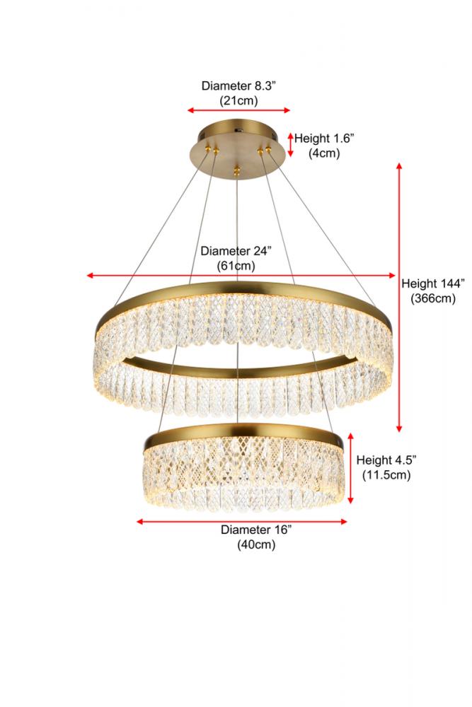 Our 24-inch Chandelier features two ring tiers, each adorned with crystals through which the light is gracefully illuminated, creating a captivating interplay of radiance and elegance in your space.