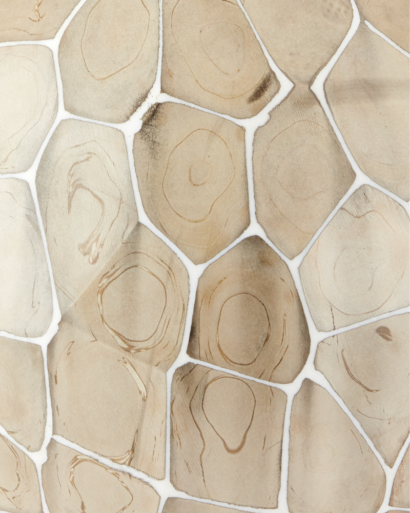 The Runnel Glass Vase Set includes two decorative vases that gain their personalities during a multi-step process that begins when organically shaped vases are created with white glass that is faceted to create a complex surface pattern. The artisans then marble the surface before grinding off the glass where the facets meet to create a mosaic look. The gray/taupe color will vary slightly from vase to vase as the marbling technique is hand-applied.
