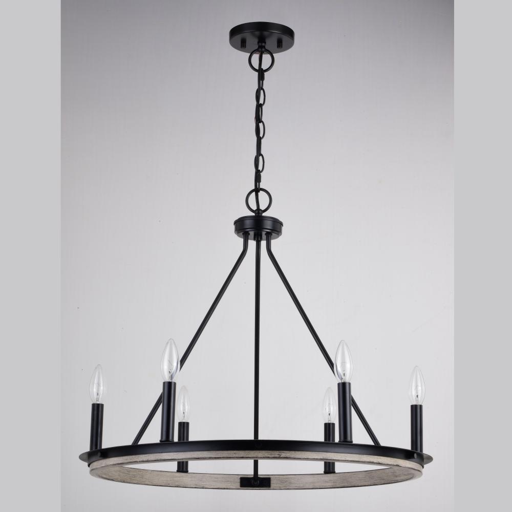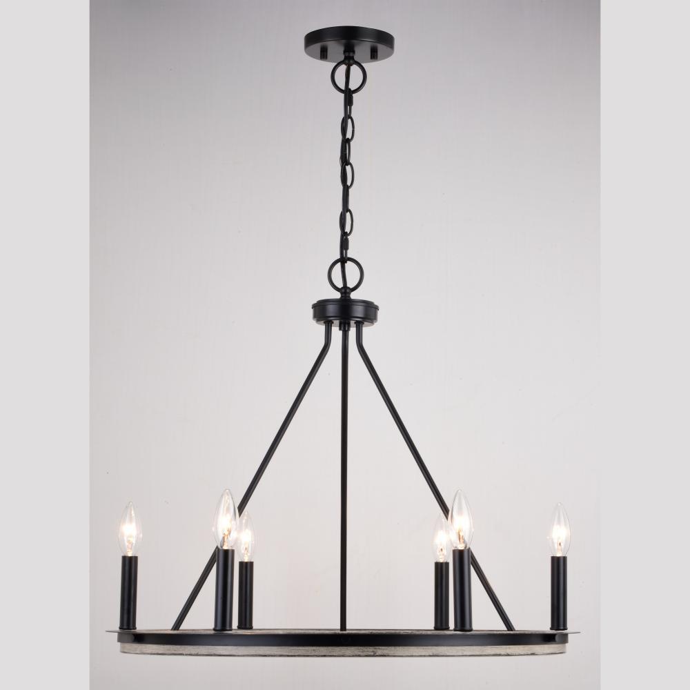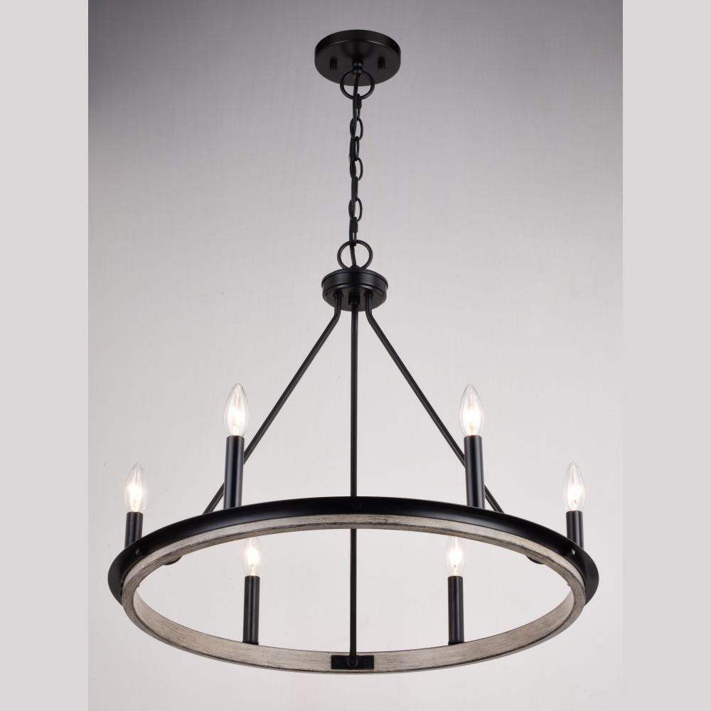 The farmhouse inspired Russel chandelier blend weathered gray and black bands to form a round wheel shape. A modern twist on an ageless design, it fits well with transitional, farmhouse, and cottage interiors. The clean lines and simple candelabra styling give it maximum versatility making it an ideal choice for kitchens, dining areas, and foyers.