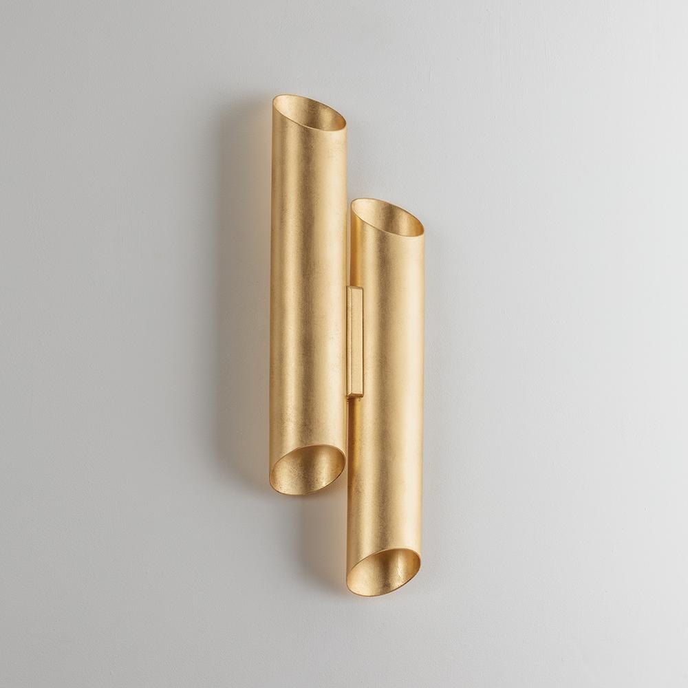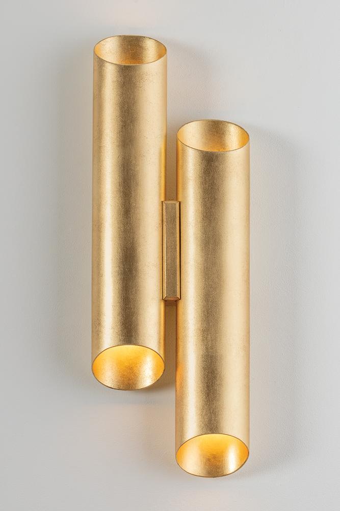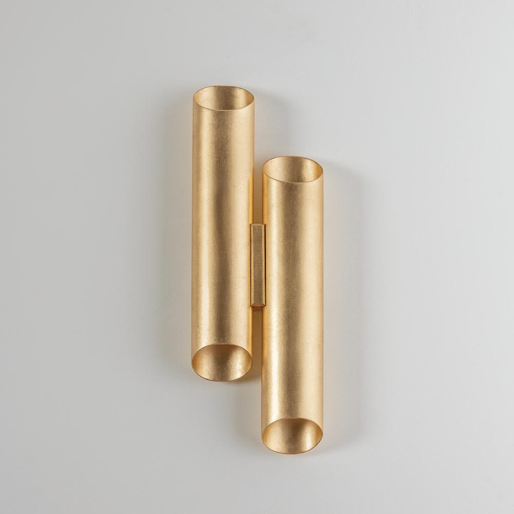The eye-catching asymmetric design of Rylane features two vertical tubular shades finished in lustrous Vintage Gold Leaf. The cylindrical forms contain two lights each, directing light both up and down. Adding a romantic glow to soft lighting schemes, this organic-inspired sconce is a modern treasure.