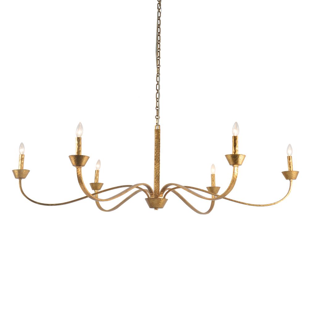 Through the use of simple curves, the Sabine Chandelier propels a straightforward take on the classic chandelier model design. Subdued yet charming, the chandelier delivers a no-frills look that says it all. Sabine features six candelabra-style bulbs and comes in two finishes: aged gold or hammered black iron.
