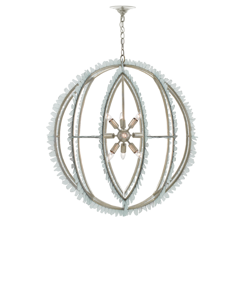 The Saltwater Orb Chandelier will enchant a space with its frosted recycled glass pieces ornamenting its wrought iron frame. Produced to mimic the beauty of the sea, the slight aqua tinge of the glass complements the contemporary silver leaf finish on the frame of this silver chandelier. Adjustable from 43.25" to 110.25" with use of included chain/rod kit/cable. If your space calls for a longer drop, additional chain/rods/cable is available for purchase.