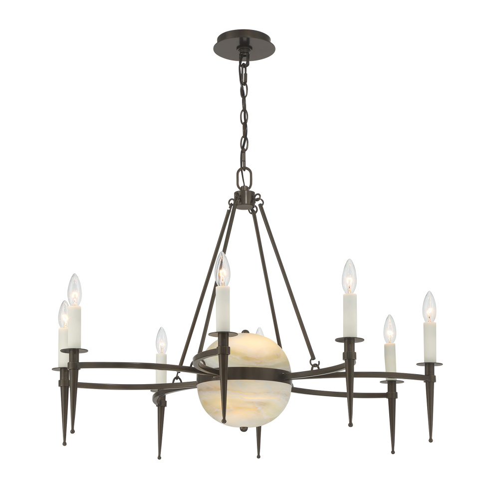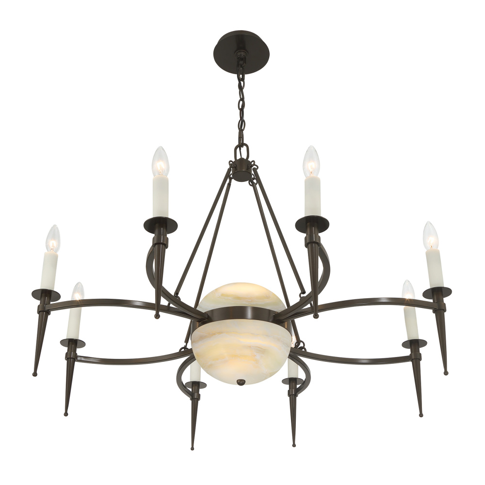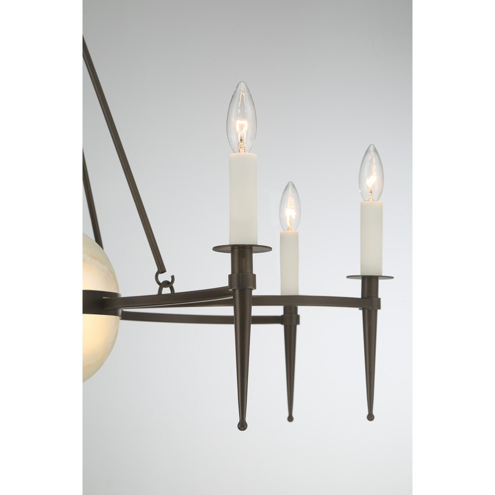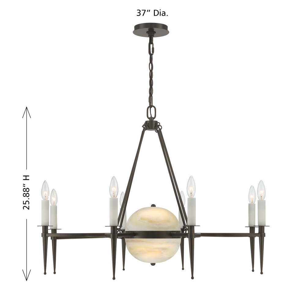 The Savoy House Sanger 10-light chandelier was designed by Dann Foley, an award-winning interior designer celebrated for impeccable style, taste and quality. This dramatic design features two layers of illumination: eight lights topping elegantly pointed, sweeping arms, plus an LED downlight that gleams from within an orb of natural onyx. The Mediterranean Bronze finish enriches the warm, organic beauty of the stone. Sanger is 25.88" in height and 37" in width. It uses ten candelabra size bulbs of up to 60 watts per bulb. Bulbs not included. Comes with 120" of chain.