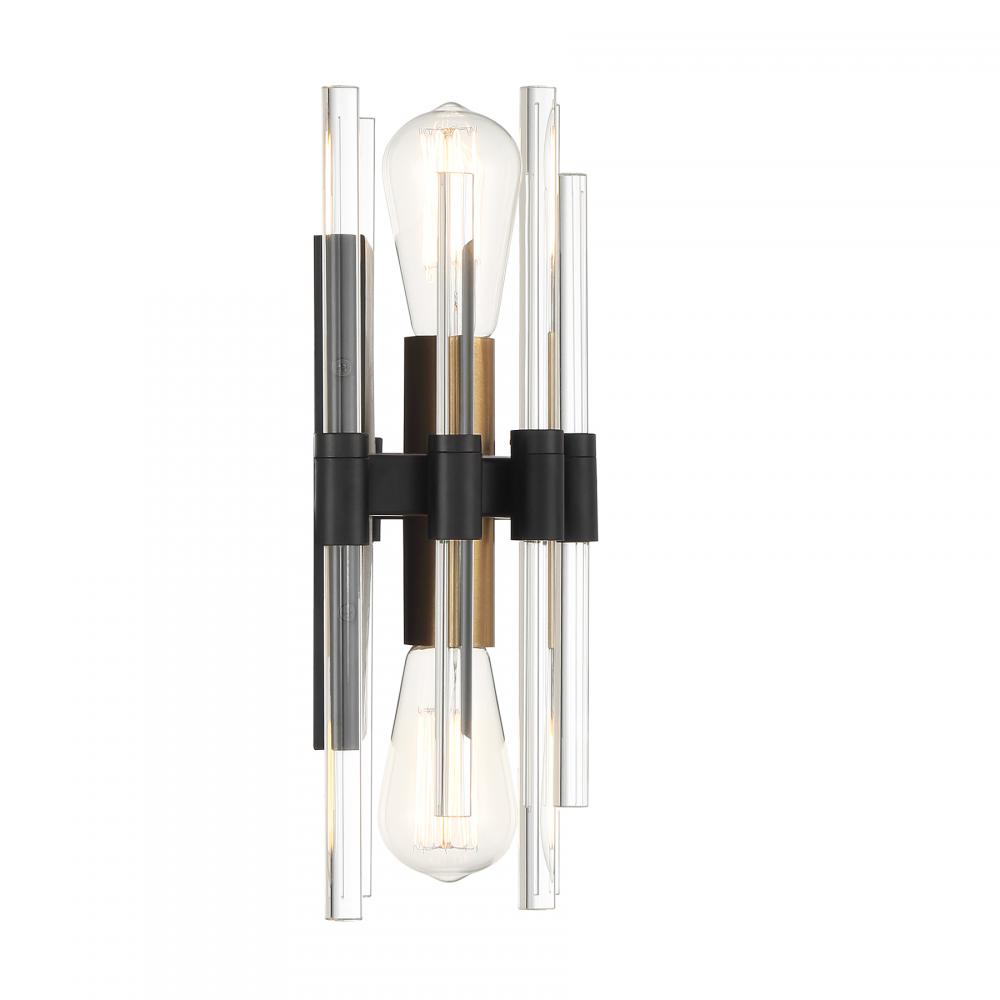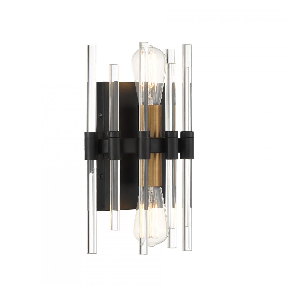 Classic, iconic Sputnik style meets chic, modern crystal details in the stylish Savoy House Santiago 2-light wall sconce. Wands of crystal create a beautiful shade that allows for bright, unobscured light. The Matte Black finish is accentuated by Warm Brass for extra boldness. Santiago is 13.25" in height, 8" in width and extends 4.5" from the wall. It uses two standard size bulbs of up to 60 watts per bulb. Bulbs are not included. This sconce is damp area rated.