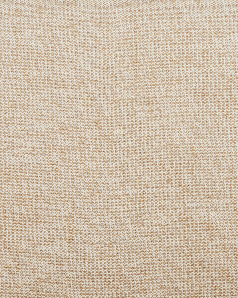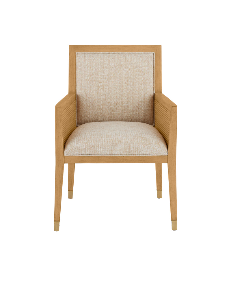 The Santos Sea Sand Armchair has a split rattan pattern on the back, and on the inside and outside of the arms, which is made by hand and applied to a solid mahogany frame. Once the natural material is in place, a sea sand finish covers the back, frame, and legs. The tan armchair is upholstered in a Liller Malt material. The chair has brass ferrules to add sophistication to the overall design.