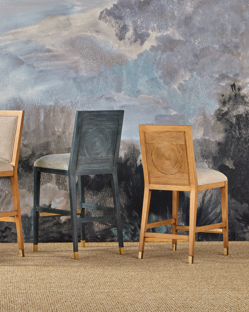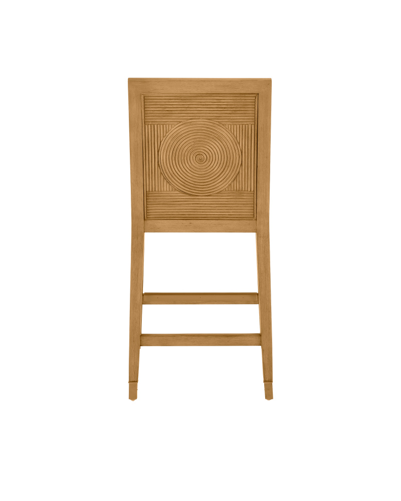 The Santos Sea Sand Counter Stool has a split rattan pattern on the back, which is made by hand and applied to a solid mahogany frame. Once the natural material is in place, a sea sand finish covers the back, frame, and legs. The tan counter stool is upholstered in a Liller Malt material. The stool has brass ferrules with a capped step to add sophistication to the overall design.
