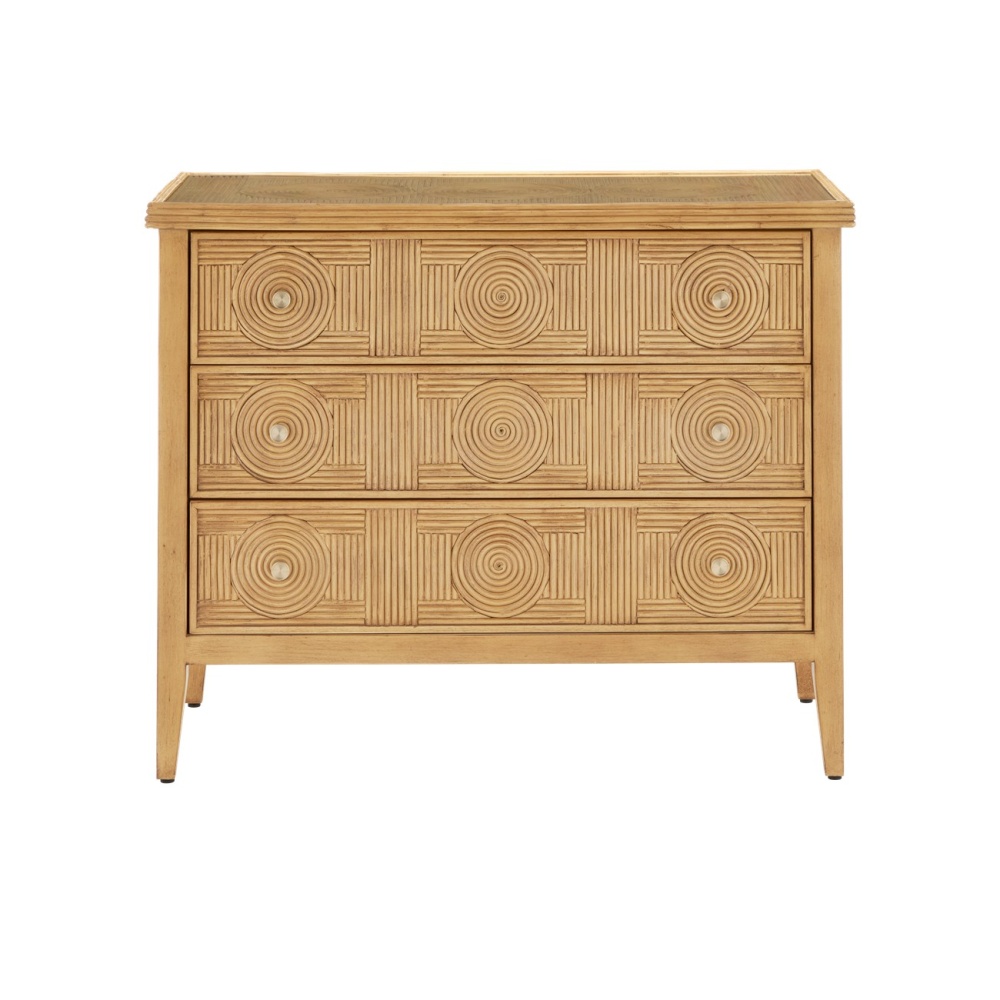 The Santos Sea Sand Large Chest has a split rattan pattern on the drawers, sides, and top, which is made by hand and applied to a solid mahogany frame before the entire piece is covered in a Sea Sand finish. A design detail of note is how the brass pulls sit squarely in the center of the circles created by the pattern. This tan chest has solid mahogany dovetail drawer boxes, soft-close drawer slides, and adjustable glides.
