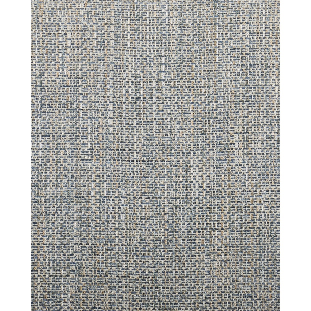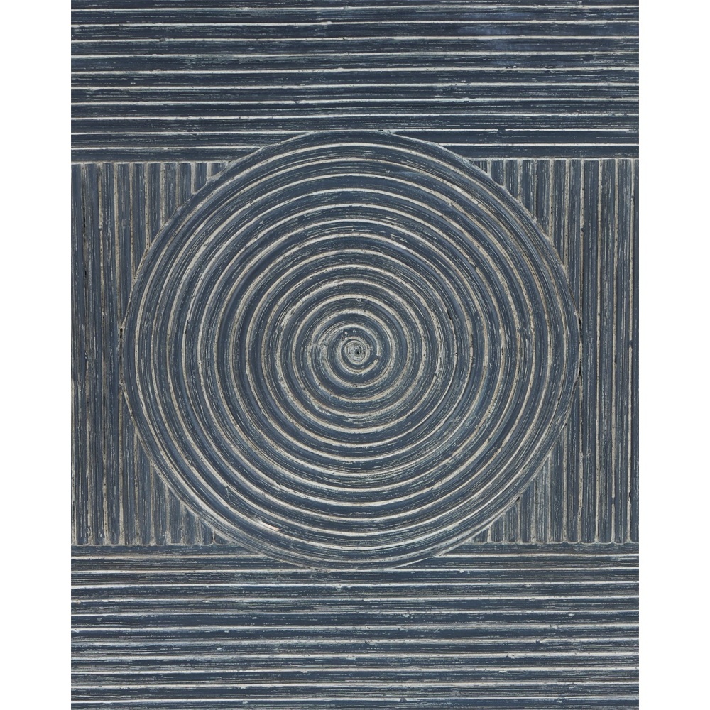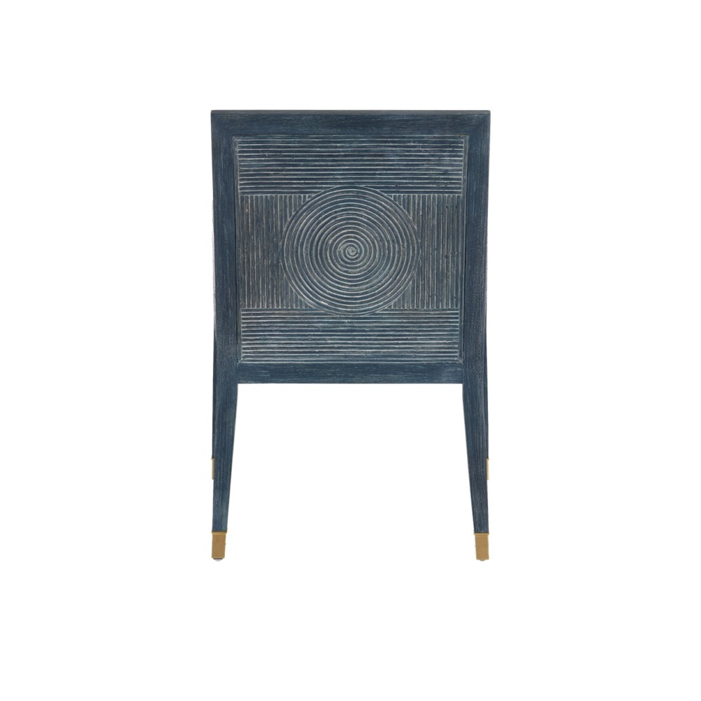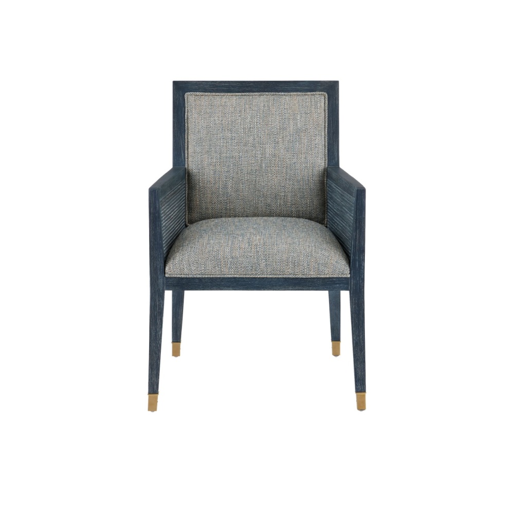 The Santos Vintage Navy Armchair has a split rattan pattern on the back, and on the inside and outside of the arms, which is made by hand and applied to a solid mahogany frame. Once the natural material is in place, a vintage navy finish covers the back, frame, and legs. The blue armchair is upholstered in a Barrett Dusk material. The chair has brass ferrules to add sophistication to the overall design.