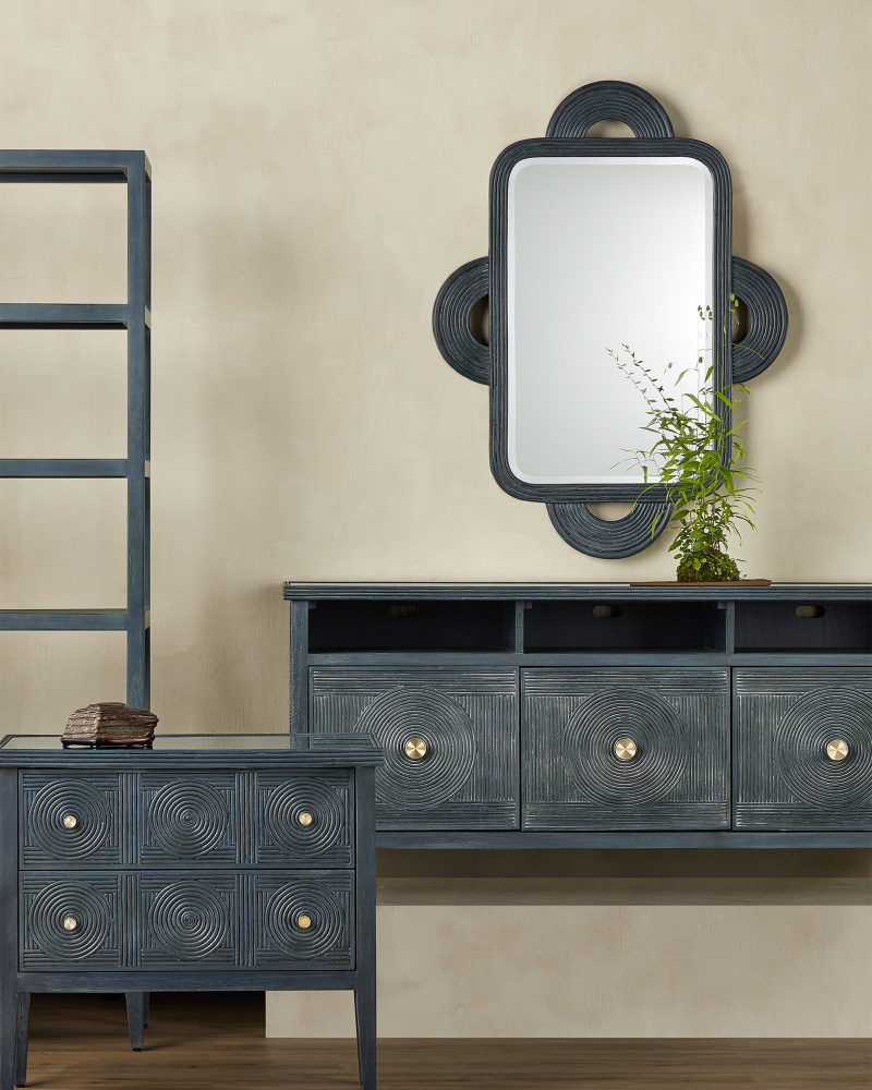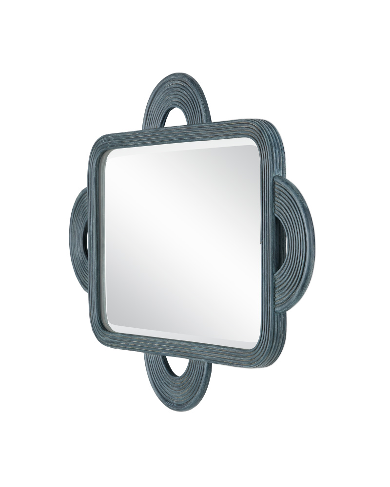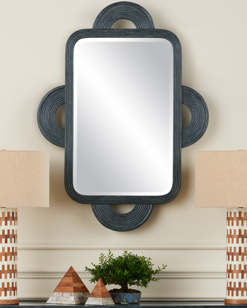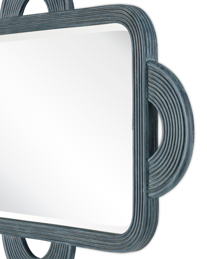 The Santos Vintage Navy Rectangular Mirror is handmade of rattan, the rounded shapes extremely difficult to achieve with such a strong material. Then a vintage navy finish covers the entire frame; the patina it brings to the navy-blue decorative mirror another design detail worth noting. The beveled edges on the mirror are also done by hand, and there are two cleats on the back so that it can be hung vertically or horizontally.