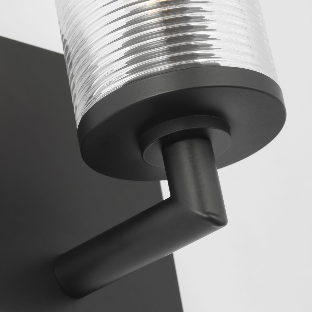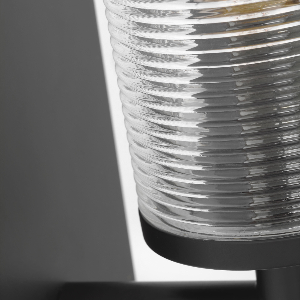 Crafted with Steel in a Midnight Black finish with clear ribbed glass shade