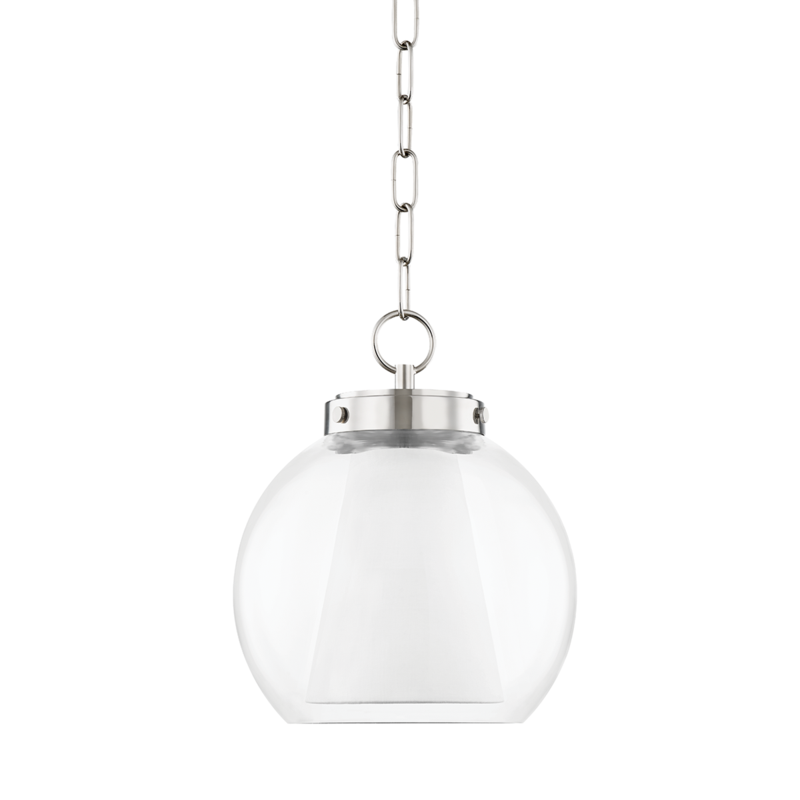 A chain cord, metal finish canopy and unique shade-within-a-shade design make this Sasha totally fierce. A white, Belgian-linen, cone-shaped shade is covered by a clear glass globe shade to emit a soft glow that shines bright. With two pendant sizes in three finishes (Aged Brass, Old Bronze and Polished Nickel) there's something for every space and taste.