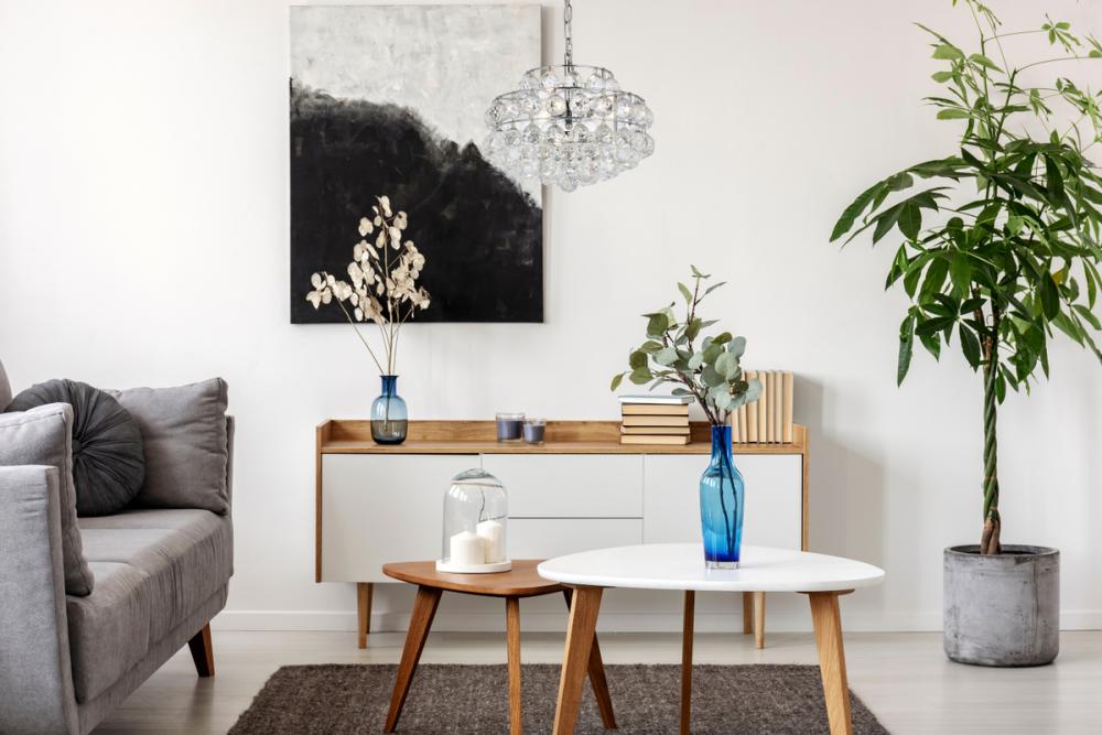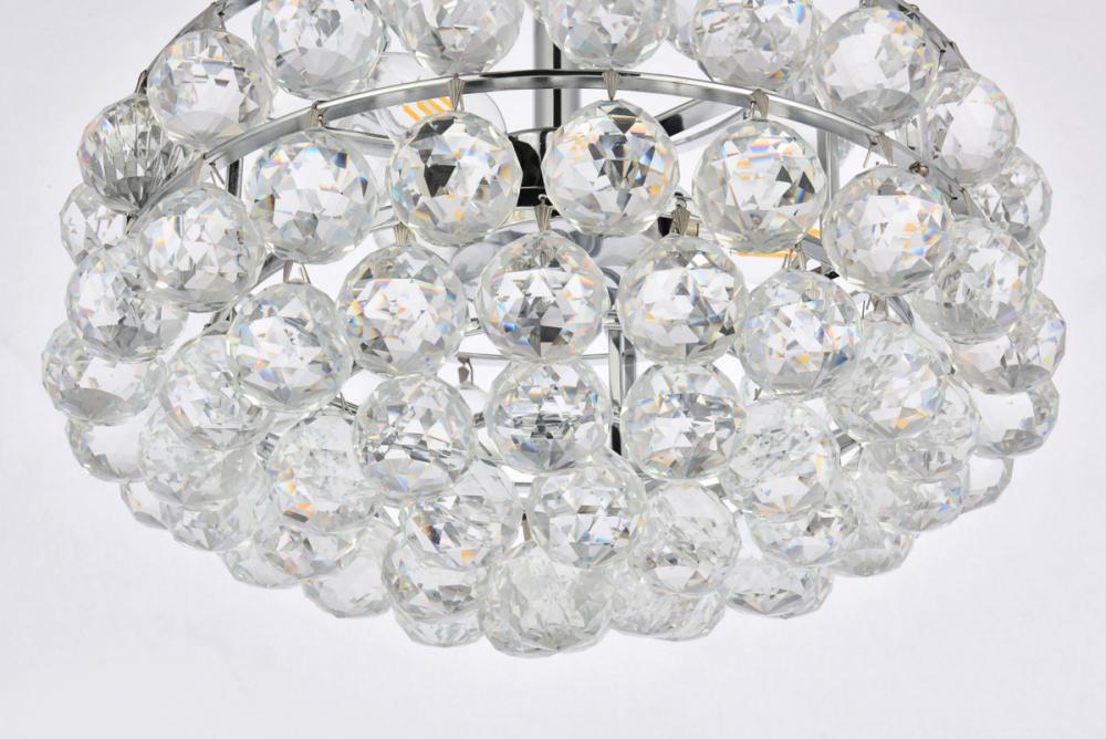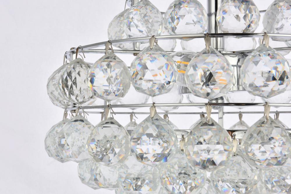 Tiers of clear multi-faceted crystals reflect the soft glow of candelabra bulbs