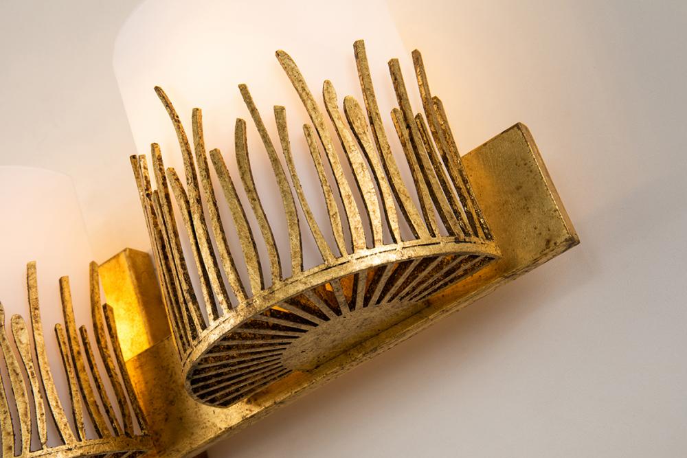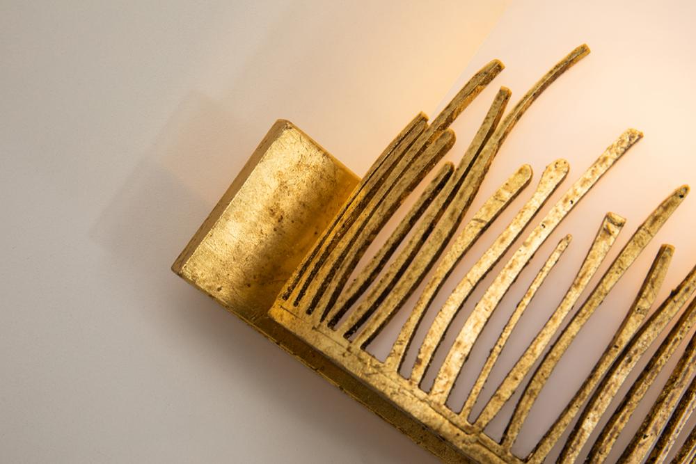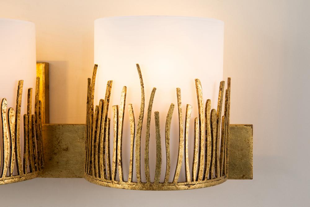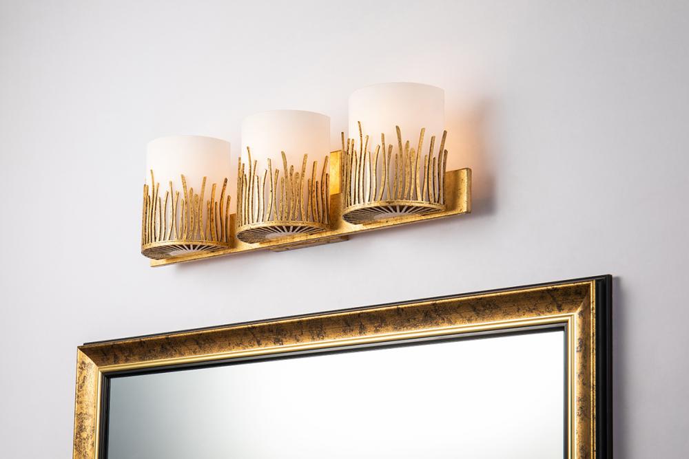 A 24" x 6.5" x 5" 3-light gold leaf vanity with frosted half-drum glass in grass-like holders. Its spa-like silhouette enhances bathrooms with detailed, stylish light.