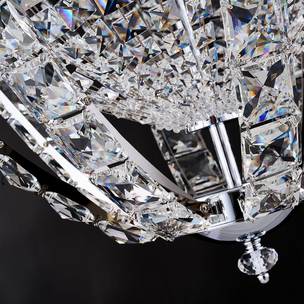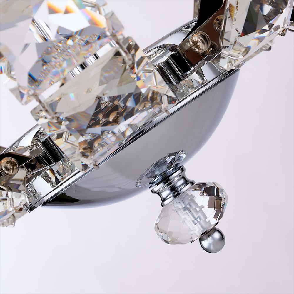 The Scudo Collection features a timeless design complemented by a Polished Chrome frame, radiating both sophistication and contemporary style. The pendant's intricate layers of crystals produce a captivating effect, gracefully floating above each other and creating a spellbinding spectacle that is sure to astonish your guests.