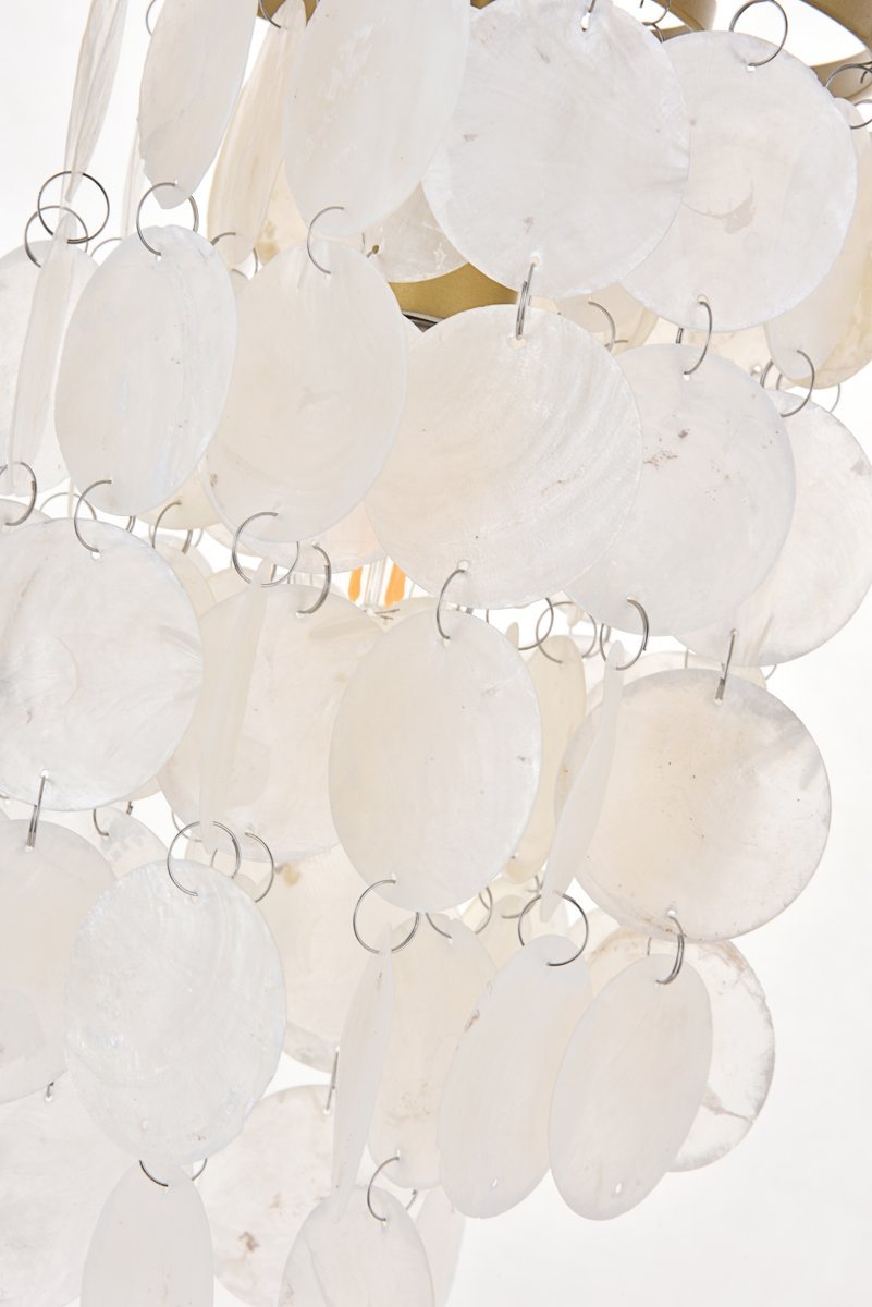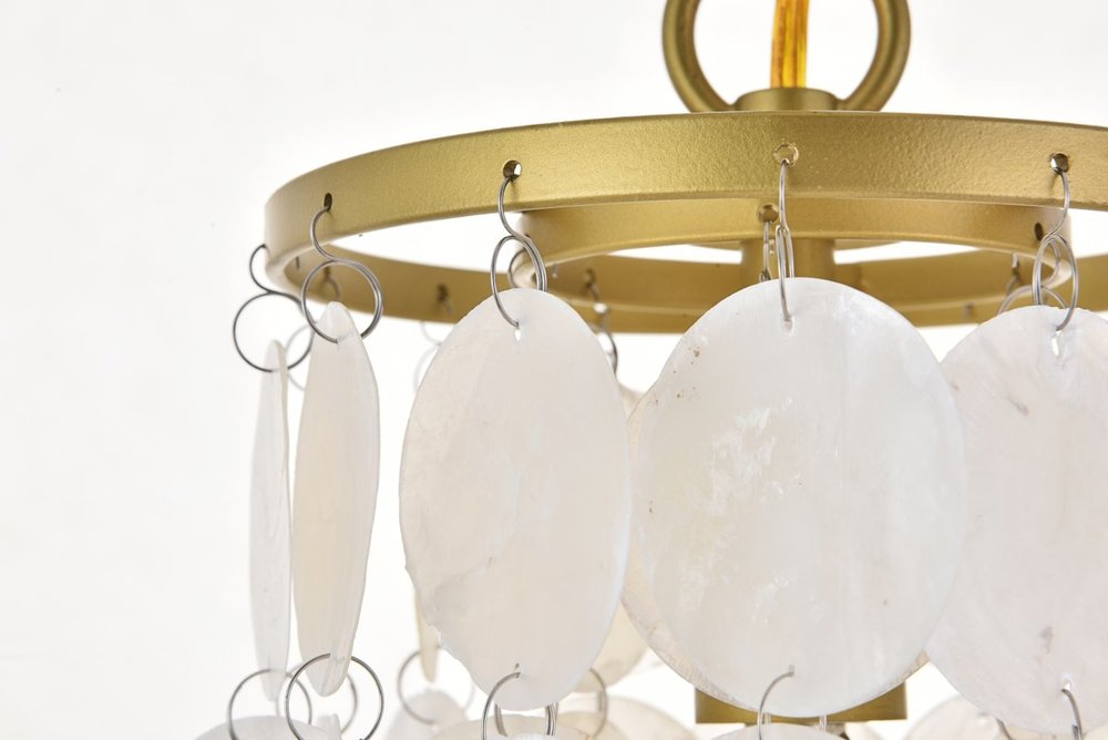Brass finish pendant with dreamy off-white shells adorning the tiers