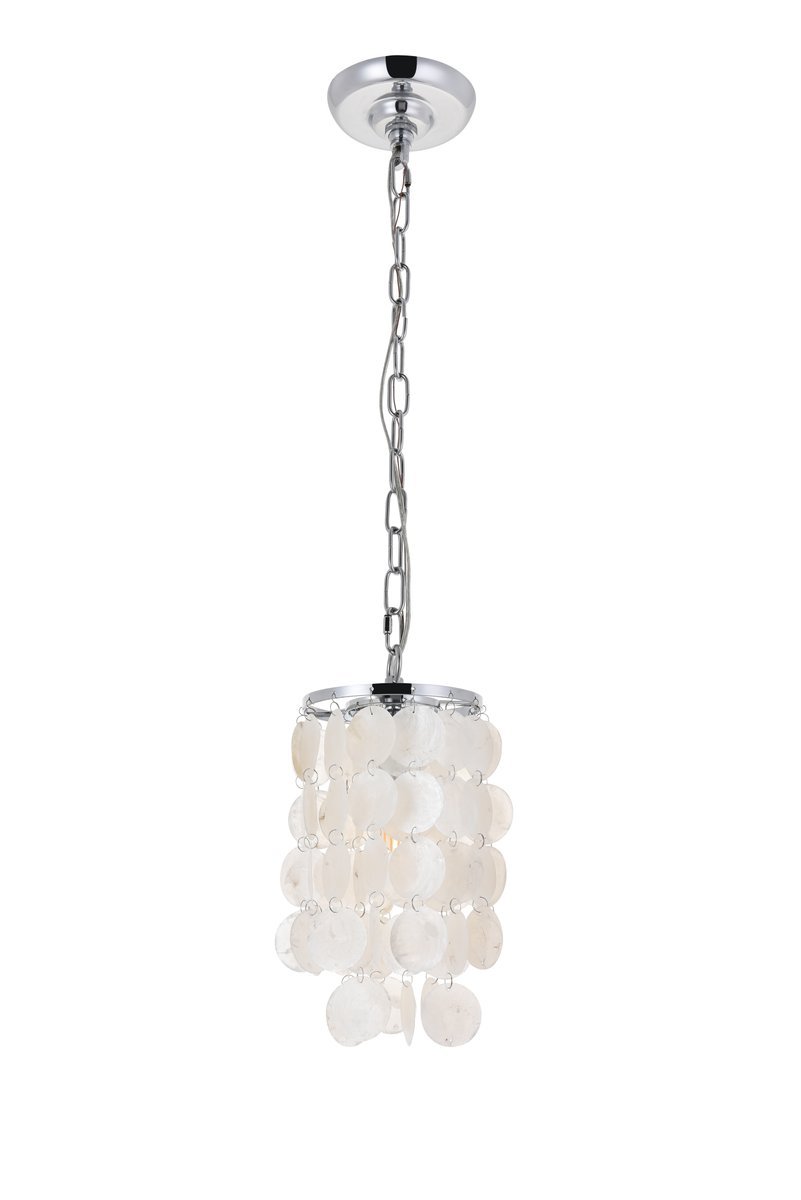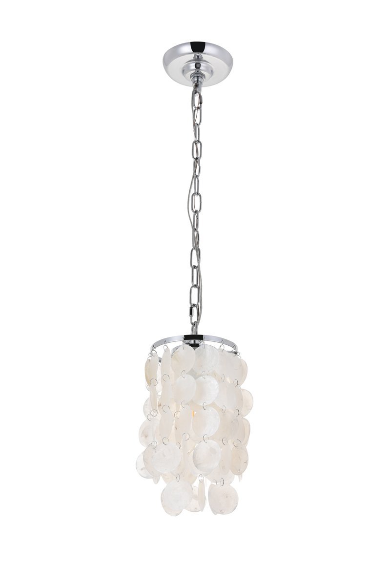 The gentleness of the Selene collection pendant lamp in a chrome finish elicits the calm temperament of the moon and the coy-- yet soothing, light it emits. Weaving through the myriad of the draped shell curtains, the illumination creates a new design every time, whether it is the shadows and highlights that changes with the direction of the light, just as the moon goes through its phases, or the shadows casted with every slight movement of the white shells. A wonderful addition to any home--foyer, living room, or a child's room.
