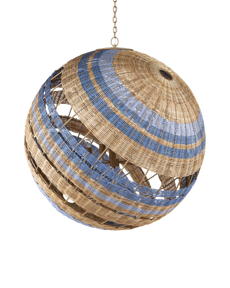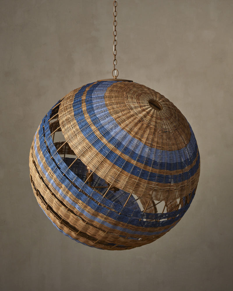 Hiroshi Koshitaka envisioned the Senjyo Tilted Orb Chandelier as one of a number of fixtures he sees as fulfilling Saisei, a concept that encompasses the acts involved in regeneration and reproduction as we restore, revive, and experience regrowth and rebirth. Rattan is woven around a wrought iron frame in stripes that graduate from a khaki finish to Bluebonnet and Cornflower blue finishes. with this tan and blue pendant, Koshitaka stays true to exploring his fascination with the Color Field tradition of the 1940s, which has been a constant in his repertoire for decades. Adjustable from 60.75" to 149.75" with use of included chain/rod kit/cable. If your space calls for a longer drop, additional chain/rods/cable is available for purchase.