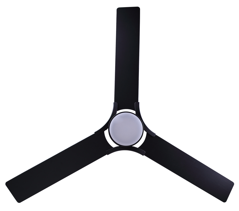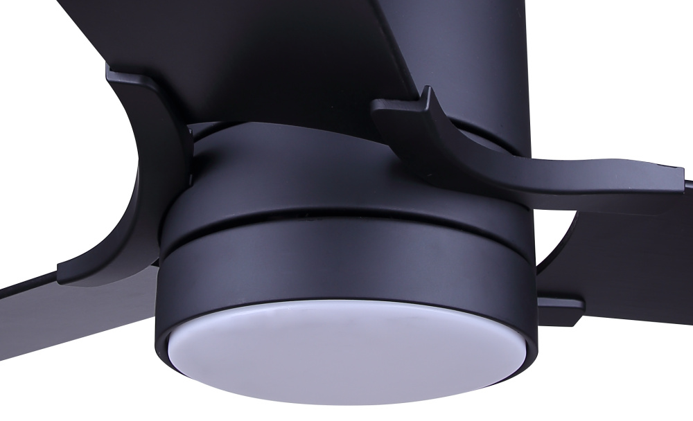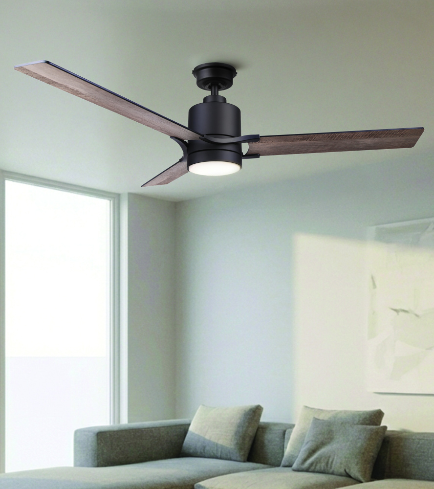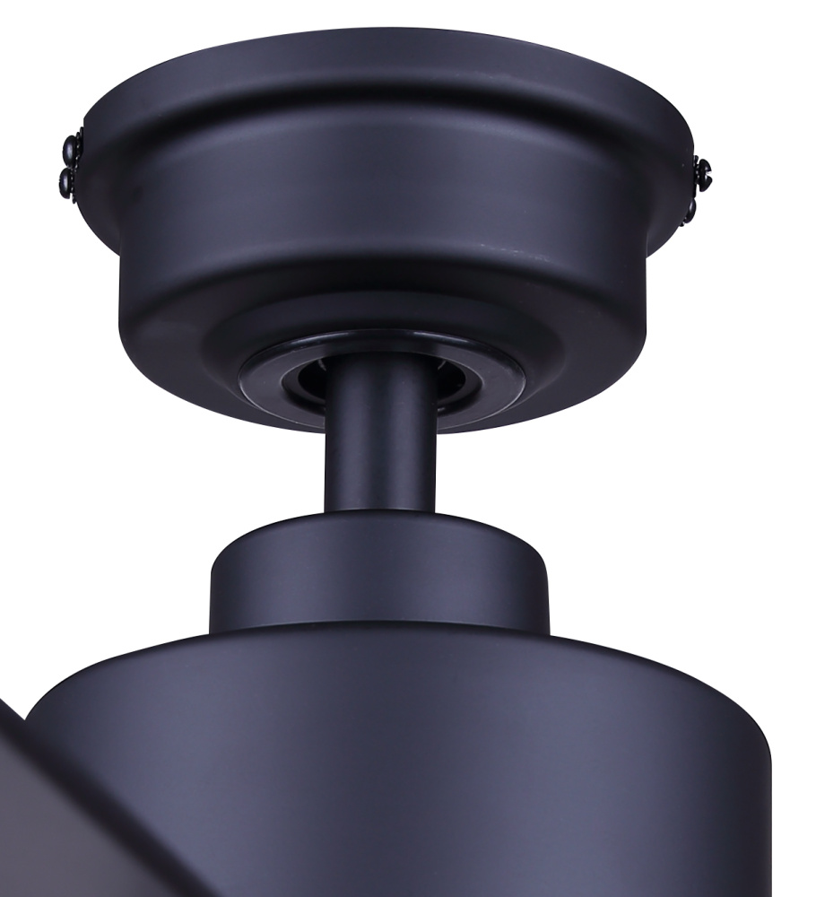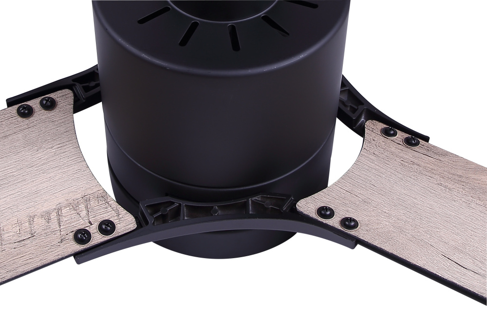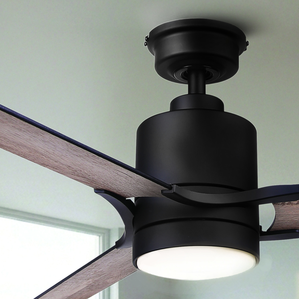Modern, Streamlined Design: A matte black finish complements reversible plywood blades in black or weathered maple for versatile style. The clean, minimal form brings modern balance to bedrooms, living rooms, or covered patios.
