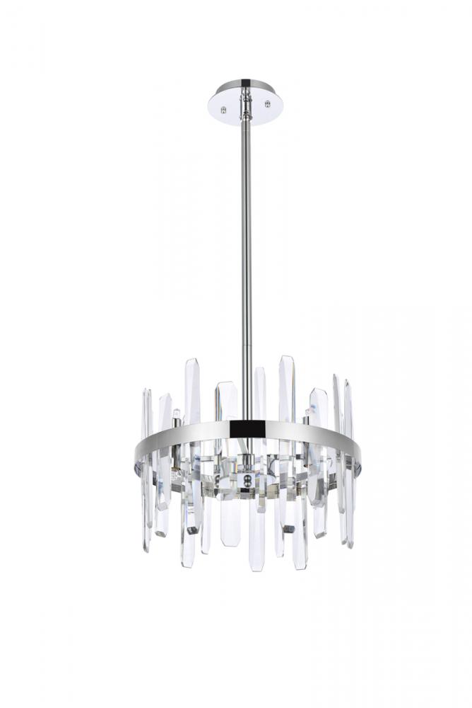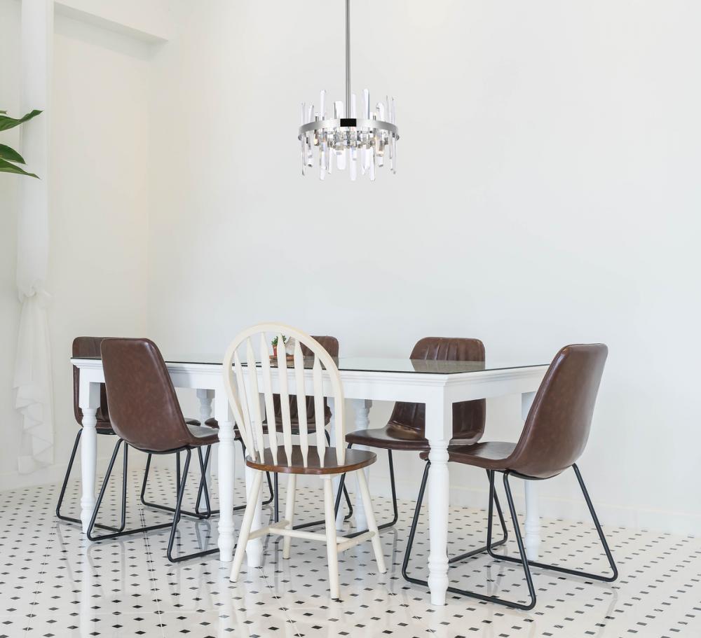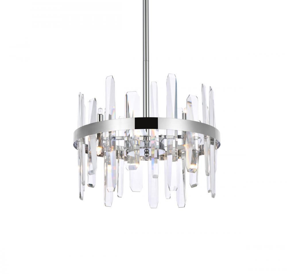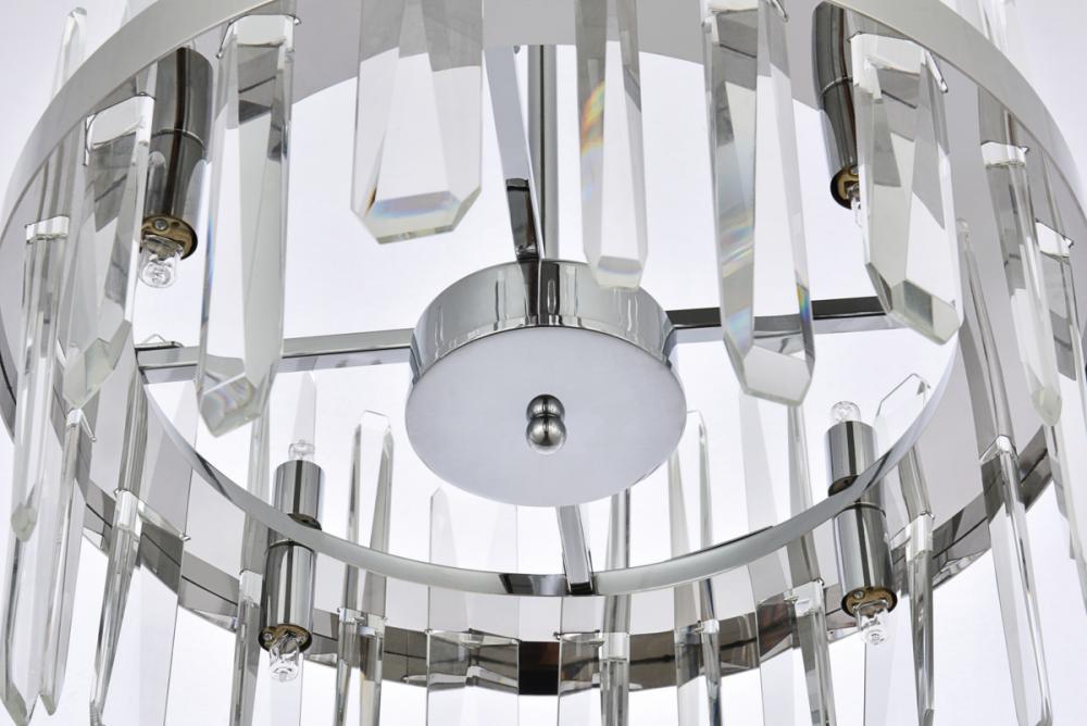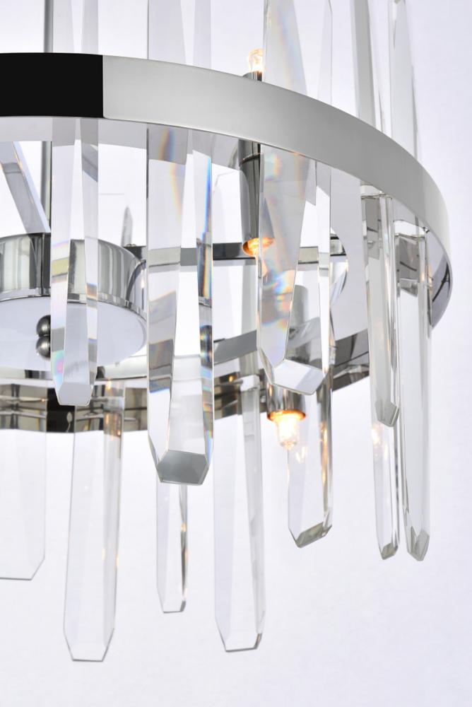 Modern crystal chandelier features top and bottom tier crystal prisms staggered along the wrought iron frame. The thick metal frame wraps around top grade crystal prisms ensure it is built to last, definitely worth it. Hang this work of art and dim the lights for a bit of sophisticated lighting in your home. Get lost in a beautiful light and sleek design available in multiple finishes. The hanging rod conveniently comes with a slope ceiling adapter, perfect for your vaulted or angled ceiling.