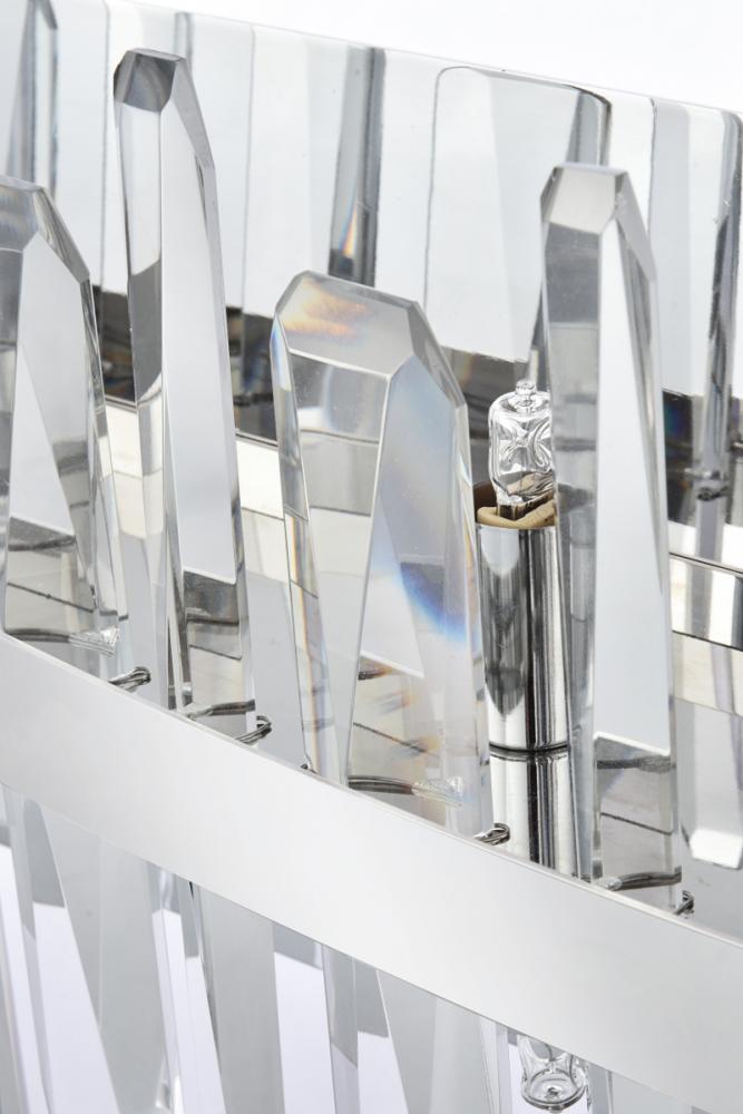 Modern crystal wall sconce features top and bottom tier crystal prisms staggered along a wrought iron frame. The thick metal frame wraps around top grade crystal prisms ensure it is built to last, definitely worth it. Mount this work of art and dim the lights for a bit of sophisticated lighting in your home. Get lost in a beautiful light and sleek design available in multiple finishes.