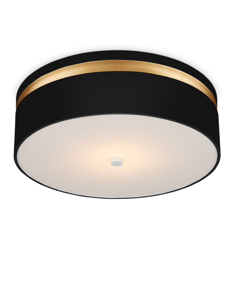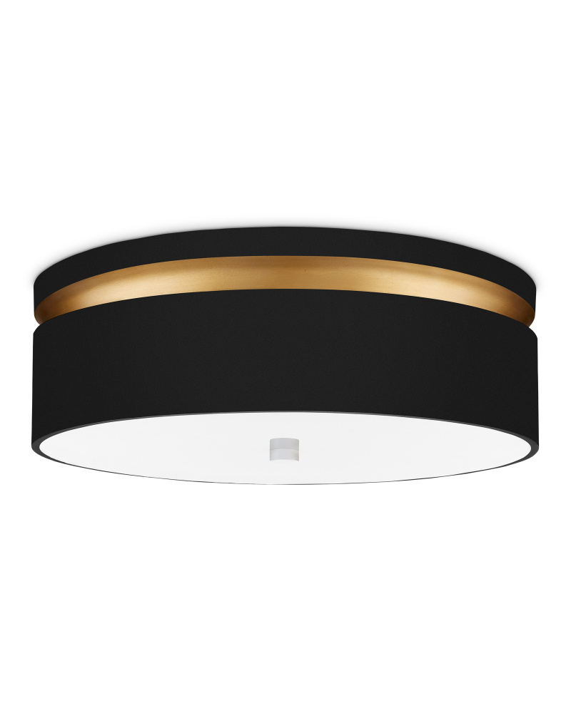The chic Serenity Flush Mount features an intermingling of dark, light, and bright tones. Made of metal, the outer perimeter is richly hued in a mix of satin black and painted contemporary gold finishes. The acrylic diffuser is fitted to the black ceiling light with a minimal finial in a sugar white finish. A design detail of note is how the integrated LED light wafts through the shade to illuminate the gold band.