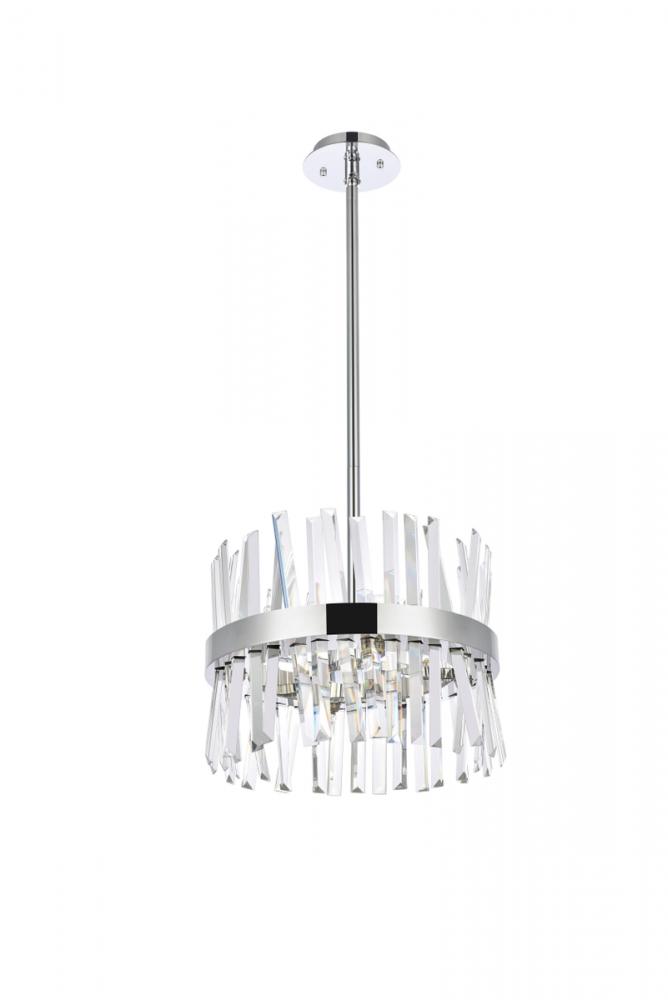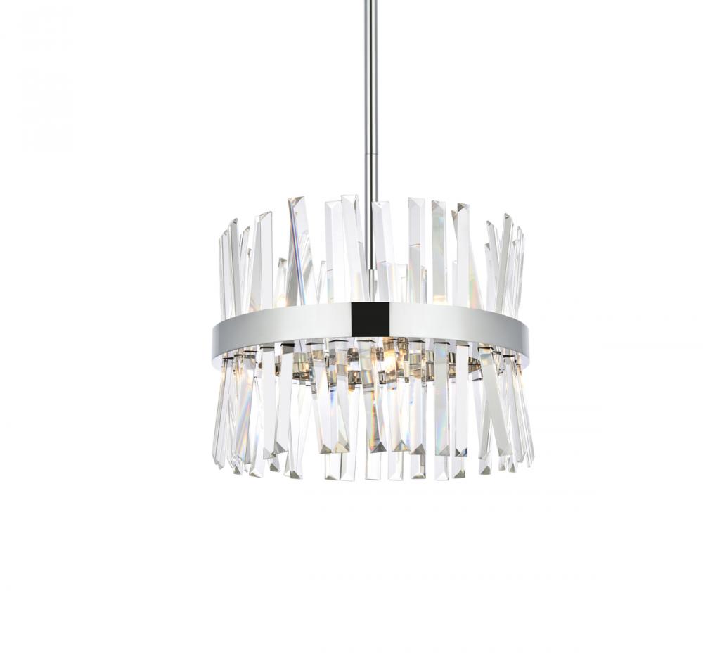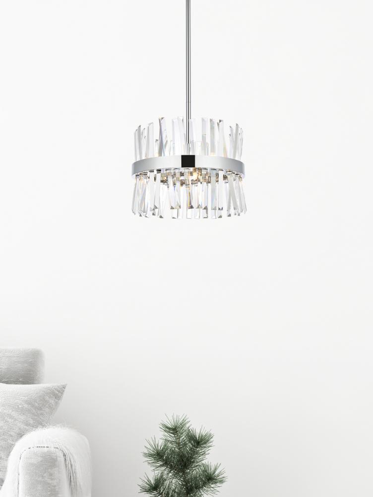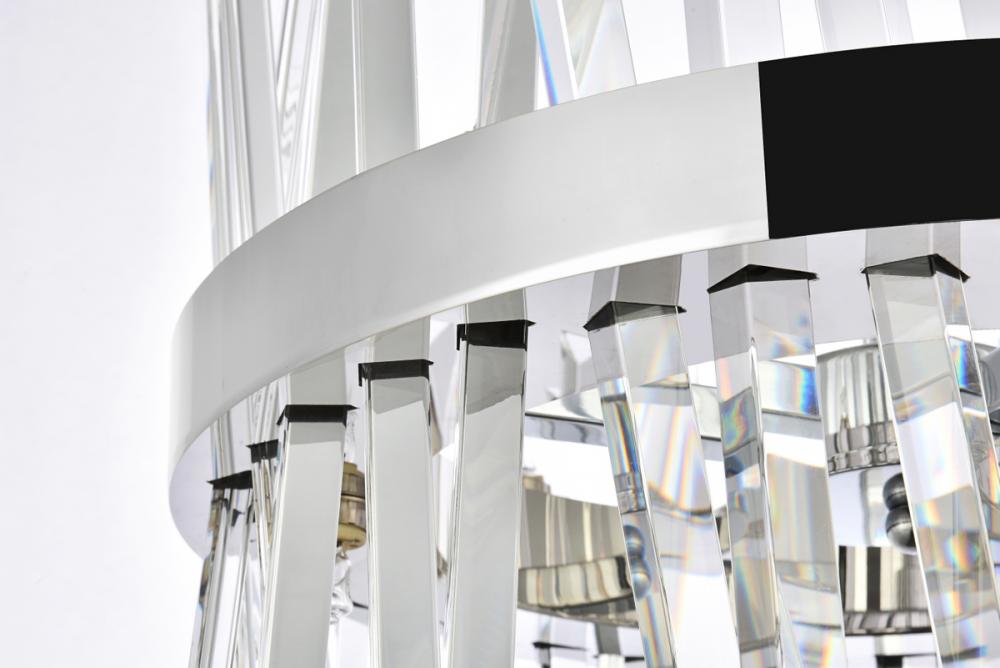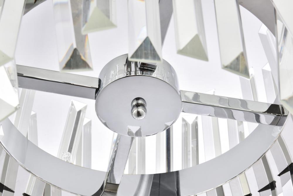 Modern crystal chandelier features top and bottom tier crystal prisms staggered along the wrought iron frame. The thick metal frame wraps around top grade crystal prisms ensure it is built to last, definitely worth it. Hang this work of art and dim the lights for a bit of sophisticated lighting in your home. Get lost in a beautiful light and sleek design available in multiple finishes. The hanging rod conveniently comes with a slope ceiling adapter, perfect for your vaulted or angled ceiling.