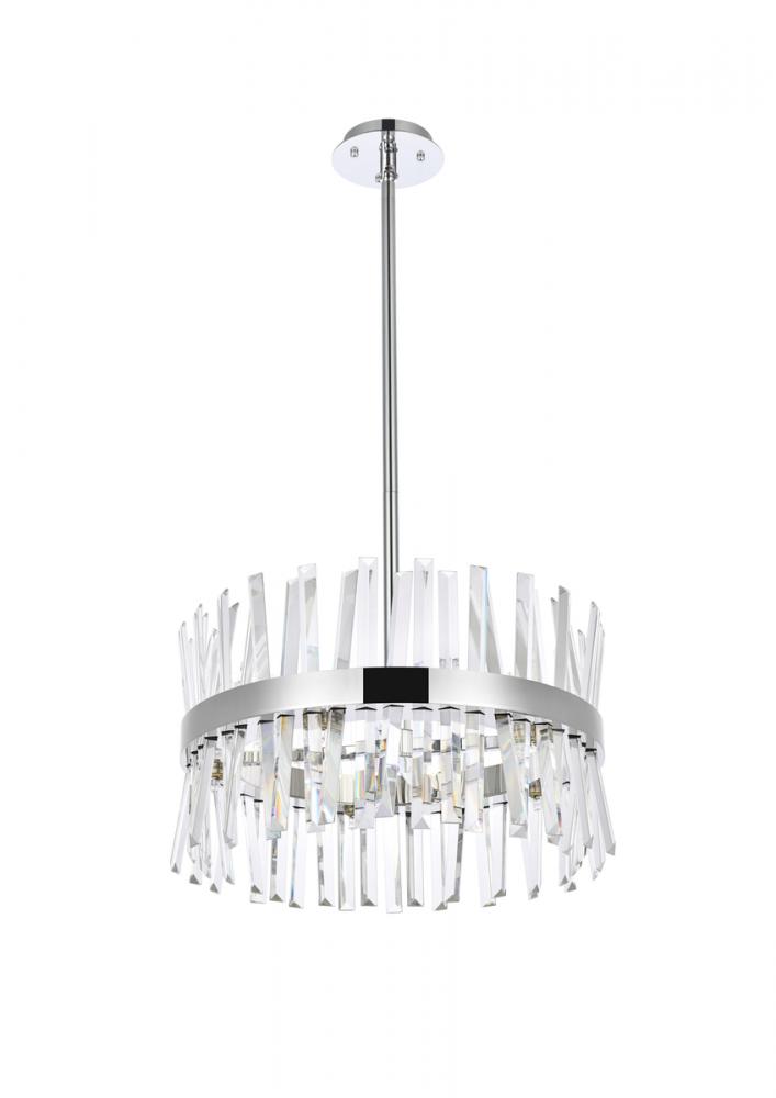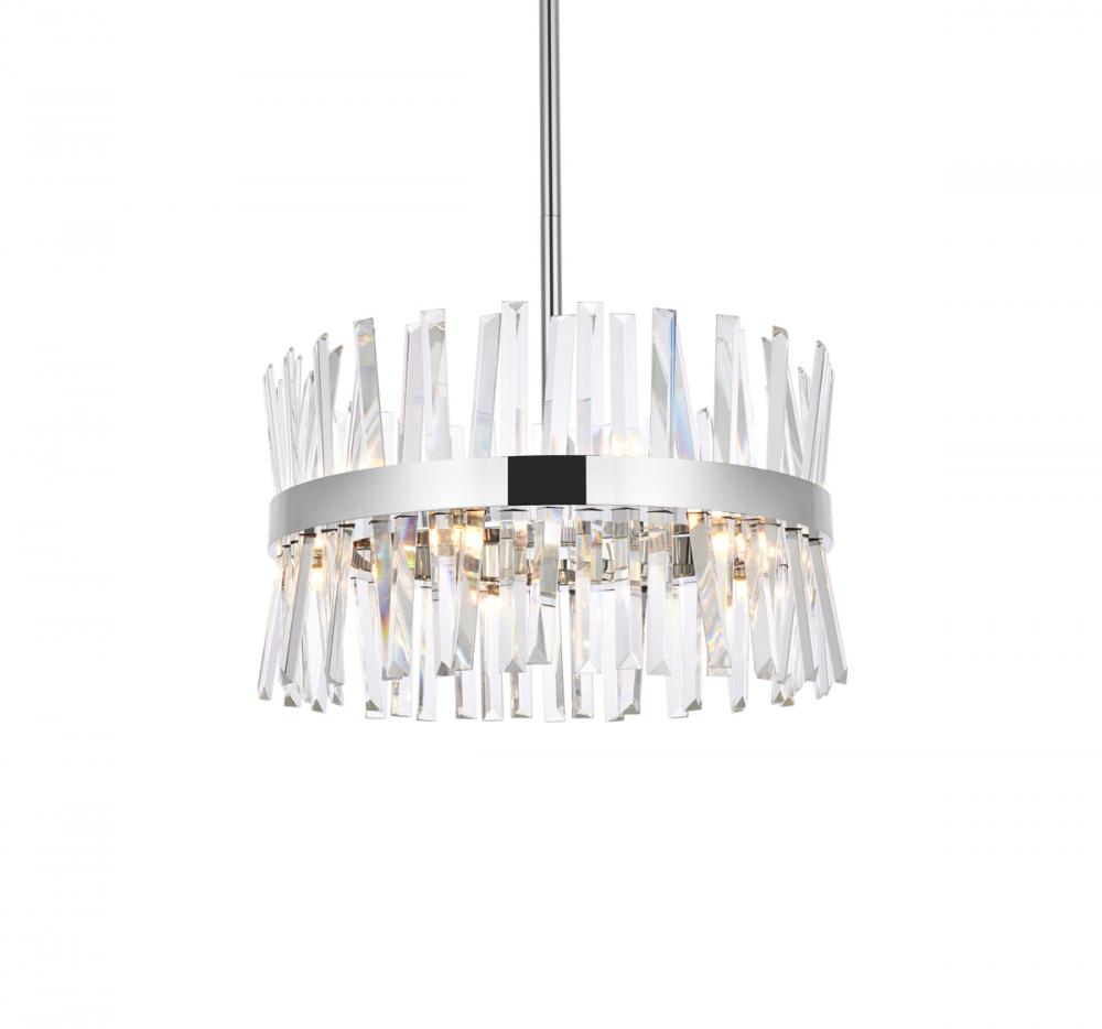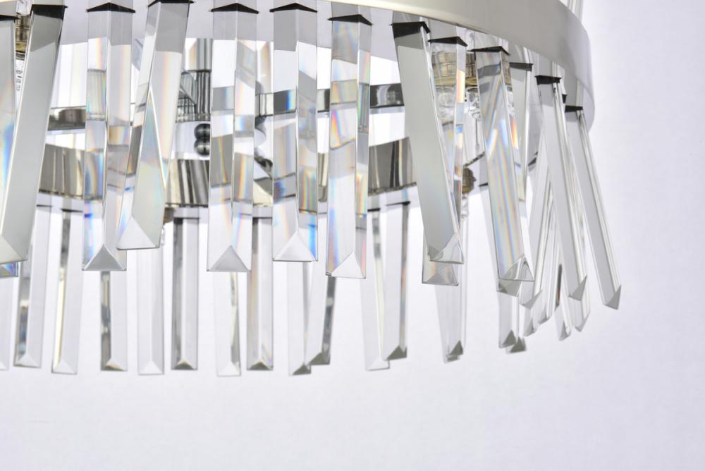 Modern crystal chandelier features top and bottom tier crystal prisms staggered along the wrought iron frame. The thick metal frame wraps around top grade crystal prisms ensure it is built to last, definitely worth it. Hang this work of art and dim the lights for a bit of sophisticated lighting in your home. Get lost in a beautiful light and sleek design available in multiple finishes. The hanging rod conveniently comes with a slope ceiling adapter, perfect for your vaulted or angled ceiling.