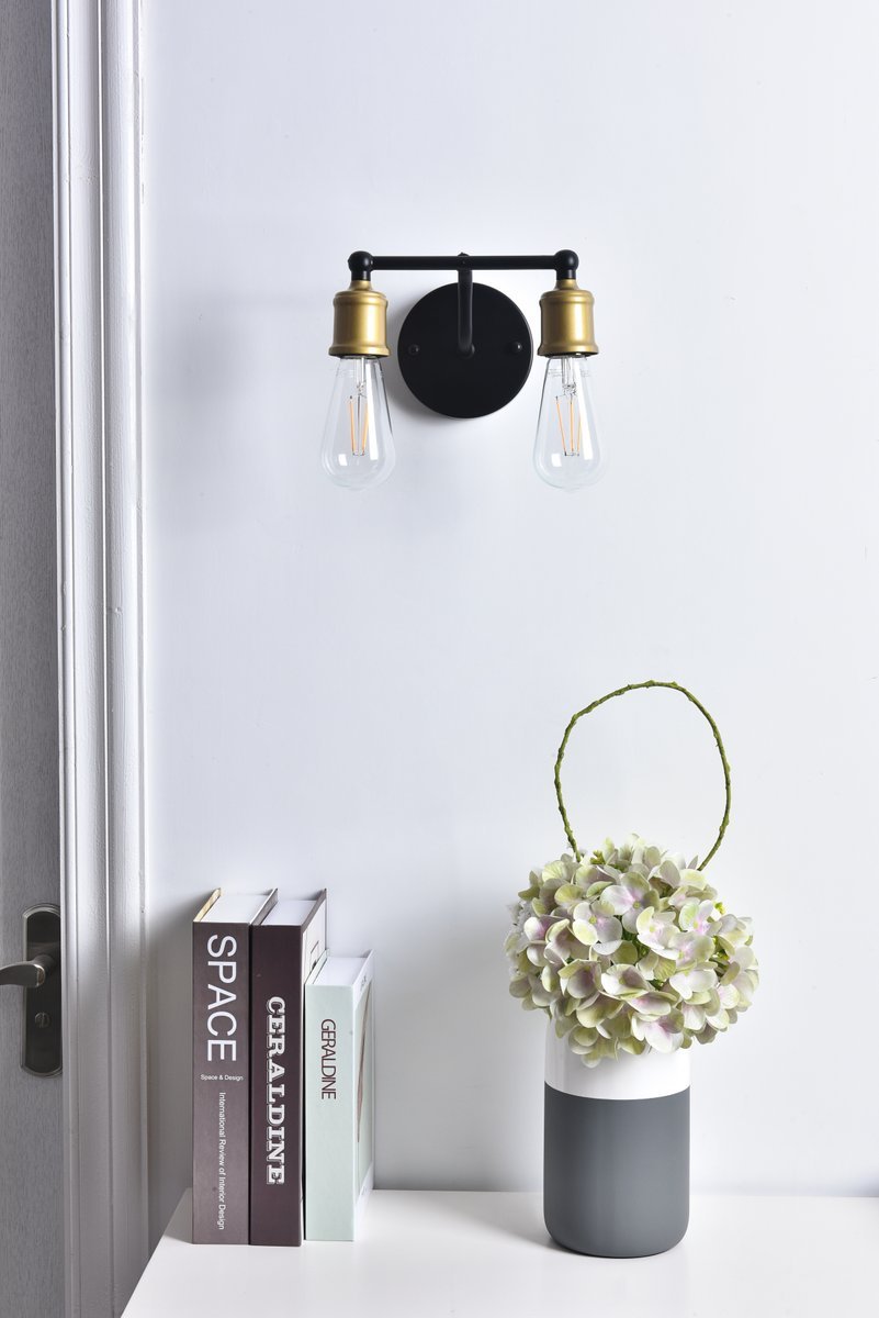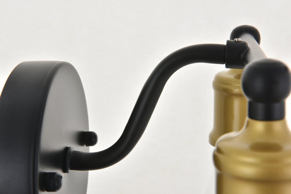 The classical elegance of the Serif collection wall lamp in a brass and black finish brings graceful allure. The arms--reminiscent of a classical font-- supports the 2 lights that emit a reassuring brilliance, and its gentle presence makes it a wonderful fixture to greet your guests at the entry way, illuminate your cabinets in the living room, or shine in the powder room.