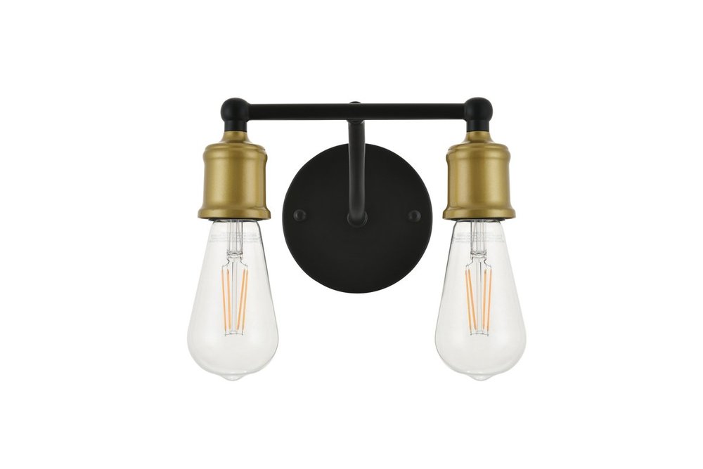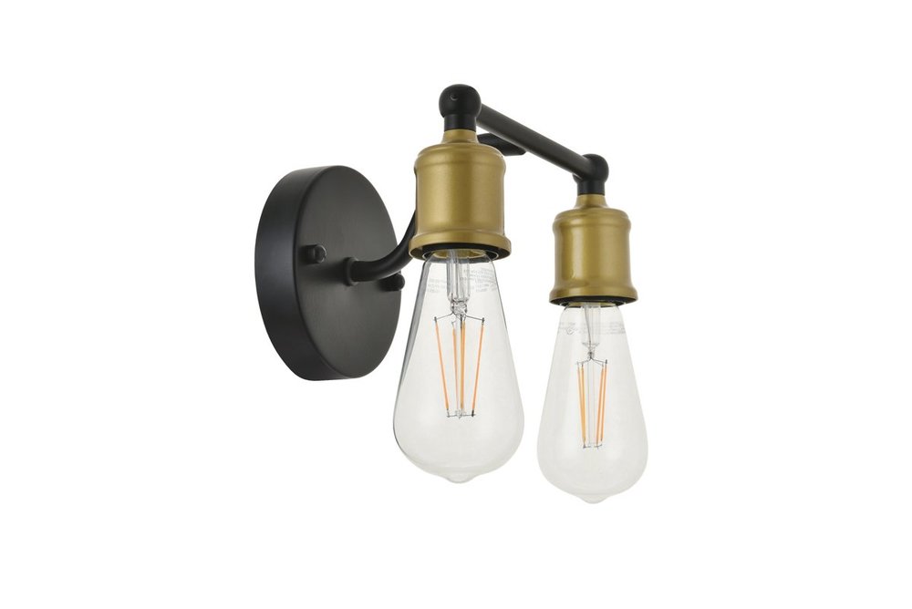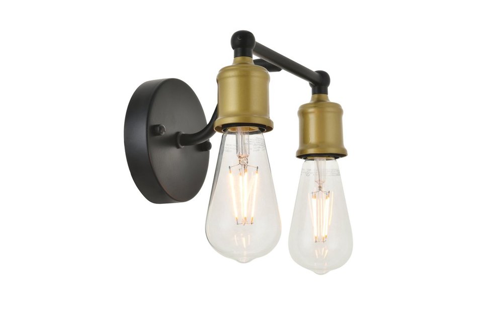 Two-toned brass and black finish 2-light wall sconce with an undulating arm and circular back plate