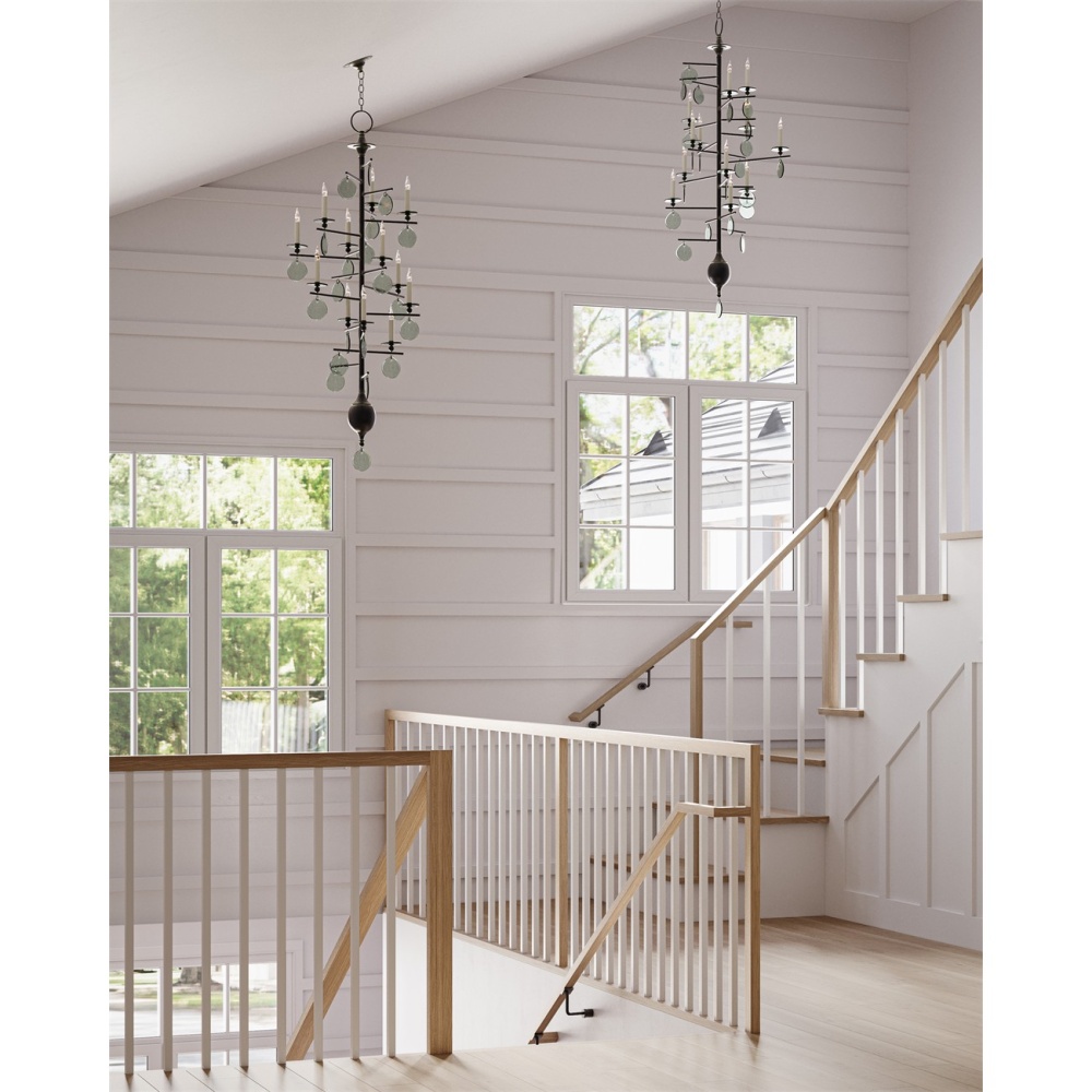 This is a very tall version of the Sethos Chandelier with its recycled glass discs and wrought iron framework that will look commanding in tall narrow spaces. The linear wrought iron frame has been treated to an old iron finish to give the design heft, while the discs of recycled glass dangling from the arms of the 12-light fixture glint when light pierces them. The unusual appearance of this chandelier will appeal to those who have grown weary of the ubiquitous candelabra.