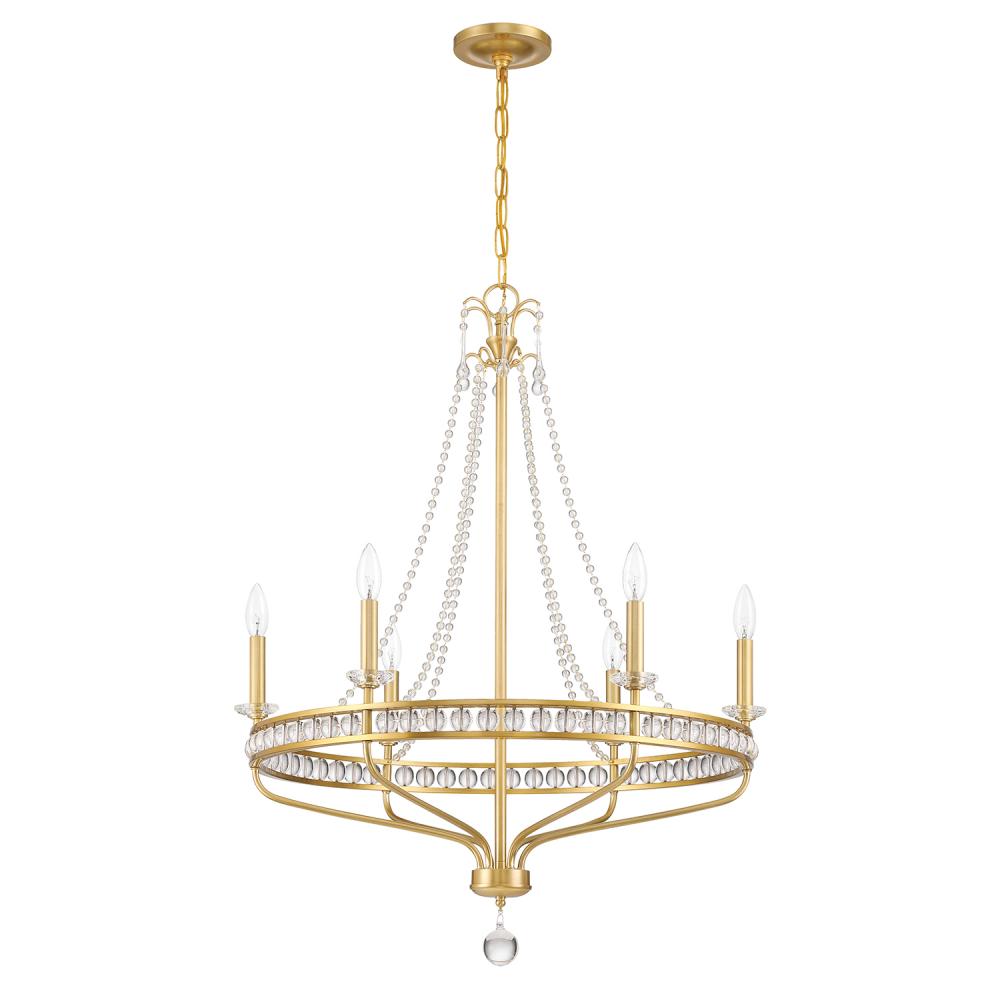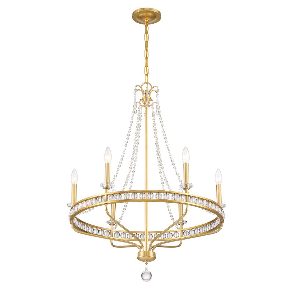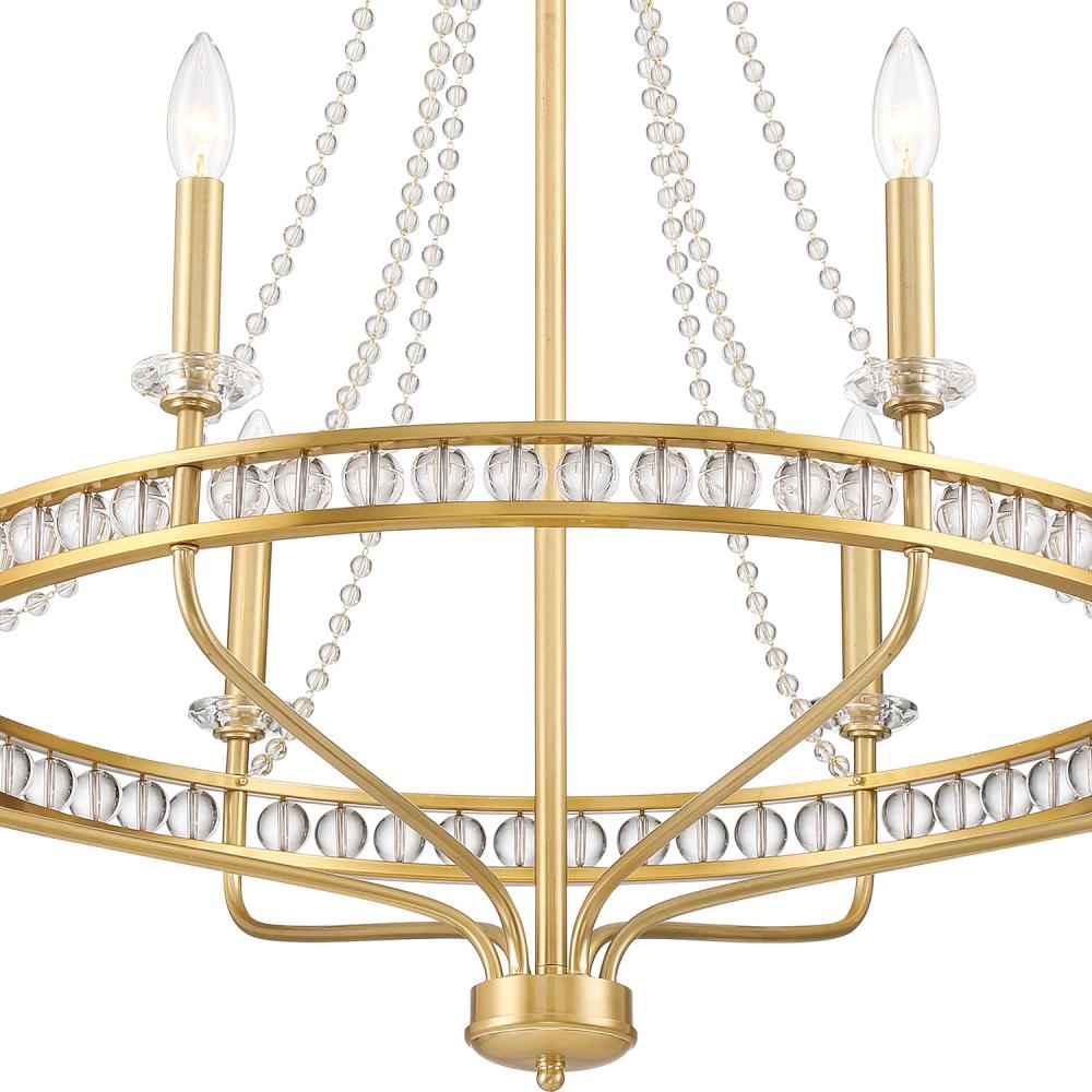 The Seville collection presents a modern take on a classic early American design. Glass balls gracefully cascade downwards, connecting to a circular gold metal framework that encases additional glass within the structure. This innovative design revamps the traditional candle-style appearance with a contemporary touch, resulting in a striking focal point that effortlessly combines classic charm with modern sophistication.